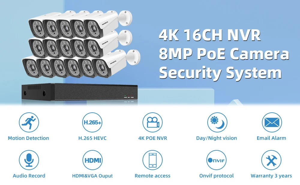 1. Все наши сетевые видеорегистраторы являются реальными H.265 4K 8MP, сетевой видеорегистратор может поддерживать 8MP и 4K max, вы можете подключить 720p,1080p,3mp,4mp ,5mp, камеры 8 МП и 4k с нашим видеорегистратором POE;2. Наш сетевой видеорегистратор поддерживает распознавание лиц, интеллектуальное воспроизведение лиц, обеспечивает видеоизображение сверхвысокой четкости, обеспечивая максимальную детализацию и четкость;3. Наш сетевой видеорегистратор и камеры поддерживают расширенное Сжатие видео H.265, питание через Ethernet,Plug and play, простота в использовании;4. Все камеры оснащены встроенным микрофоном, поддерживающим запись звука и дневное ночное видение Ultra HD;5. Все камеры изготовлены из металлического материала, IP66 водонепроницаемы, подходят для внутреннего и наружного применения, надежная безопасность дома;6. Поддержка обнаружения движения, оповещения по электронной почте, воспроизведения видео и нескольких языков;7. Поддержка Android,Iphone,Ipad, ПК, VMS,P2P view;8. Удаленный доступ в любом месте и в любое время;