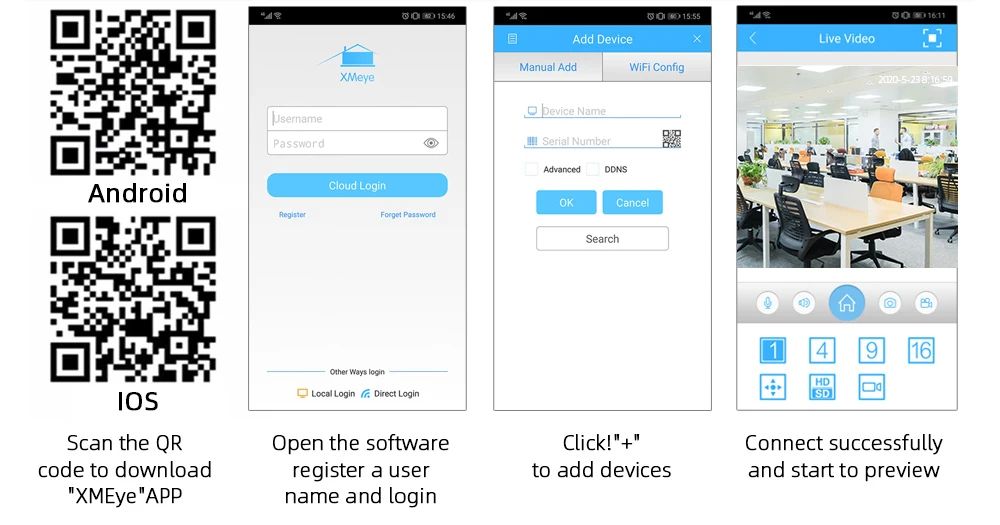 Простая настройка, всего 4 шага для Мобильный телефон просмотра, просмотр видео в реальном времени системы из любого места и в любое время с помощью смартфона, стола или ПК с передовой технологией P2P, вы можете удаленно получить доступ к вашей системе за считанные минуты или меньше, переадресация не требуется, удаленный доступ никогда не был таким простым!
