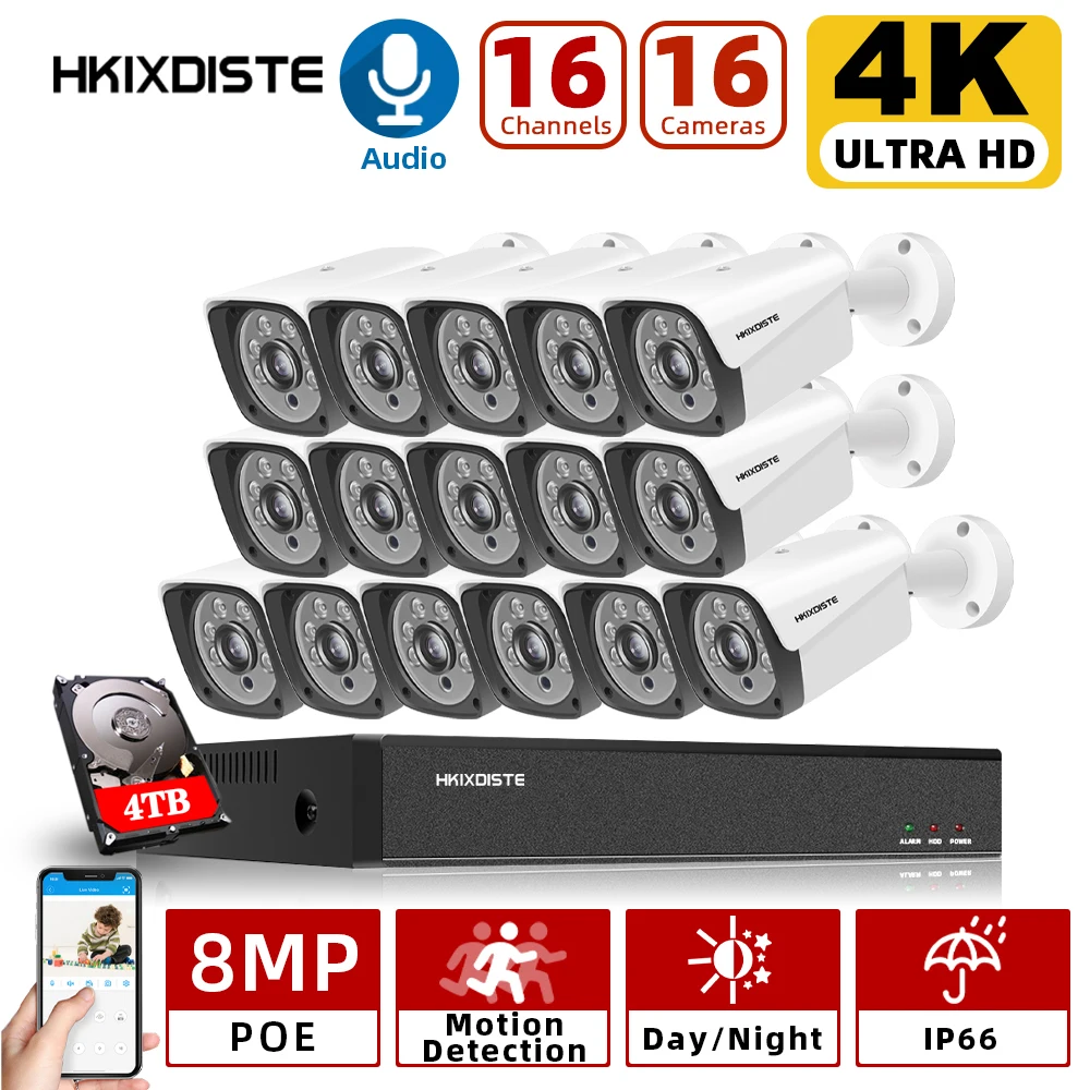 Система видеонаблюдения, 4K, H.265, 16 каналов, 8 Мп, HD, POE, NVR, наружная водонепроницаемая IP-камера с аудио и ии, комплект видеонаблюдения с жестким диском на 4 ТБ