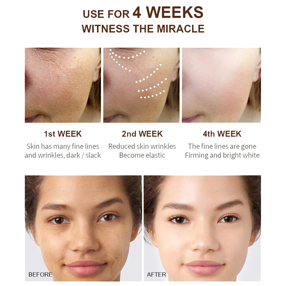1-я неделя Кожа имеет много тонких линий и морщин, темная/слабая 2-я неделя Уменьшенные морщинки кожи становятся эластичными 4-я неделя Тонкие линии укрепляют и ярко-белые