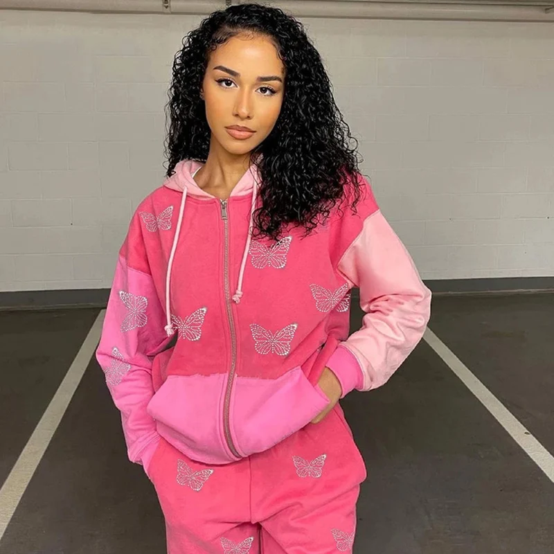 Женские толстовки в стиле Харадзюку Y2K, свитшот на молнии с бабочками, куртка, одежда с длинным рукавом, уличная одежда, кардиган, Розовый Топ