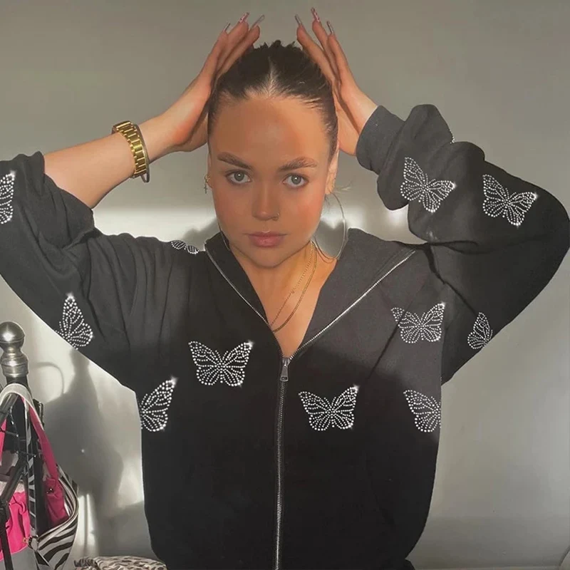 Зимние толстовки y2k с принтом Стразы бабочки на молнии в стиле Хар...
