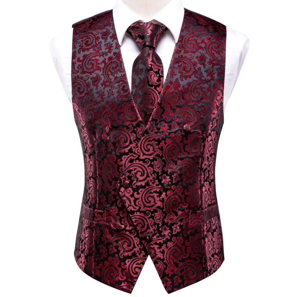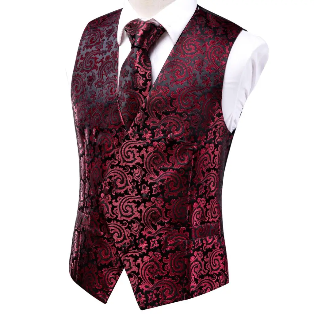 Hi-Tie бордовый черный Цветочный Шелковый мужской тонкий жилет галстук набор для костюма платье свадебное 4 шт. жилет галстук носовой Запонки Набор