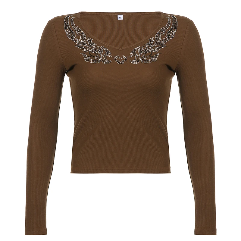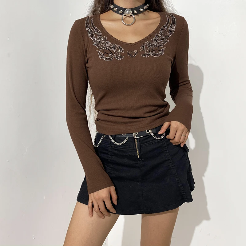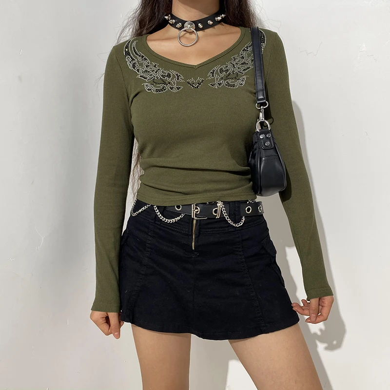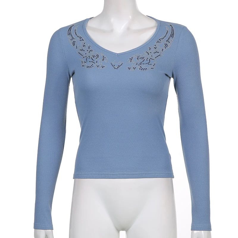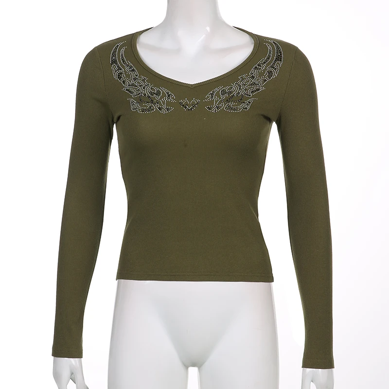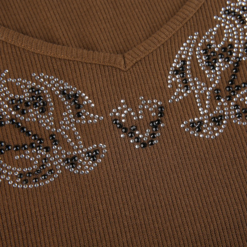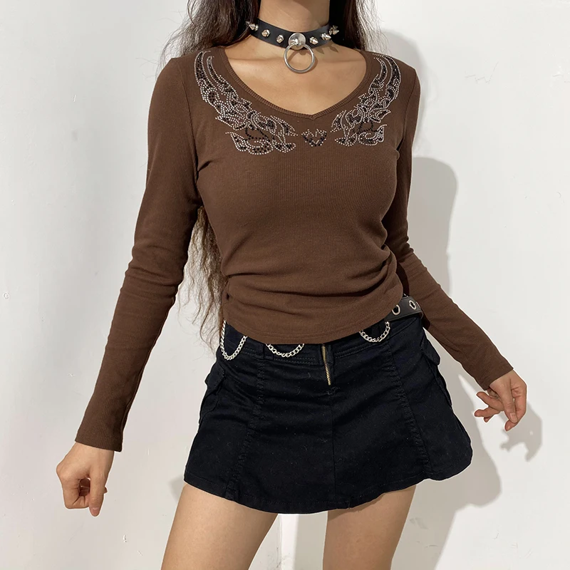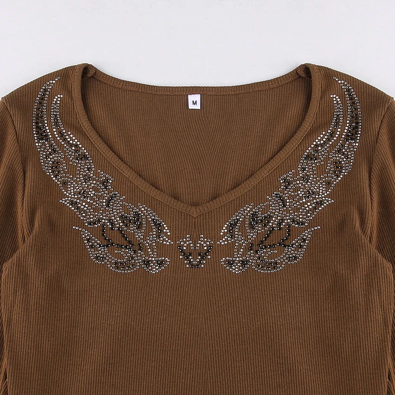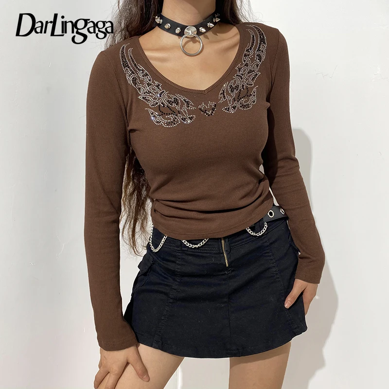 Женская Винтажная футболка с бриллиантами, осенняя Базовая футболка...