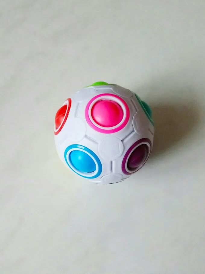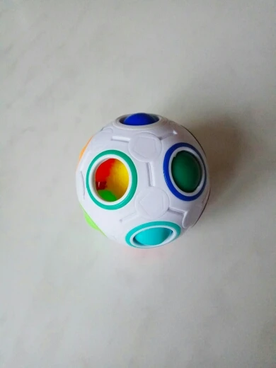 Забавная игрушка-головоломка в виде мяча, хорошее качество, прочный пластик, без запаха, небольшой размер, приятная на ощупь, яркие цвета, внутри упругая подушечка, разноцветные шарики переставляются с усилием, упакована в запечатанный прозрачный пакетик, доставка 15 дней. Спасибо продавцу.