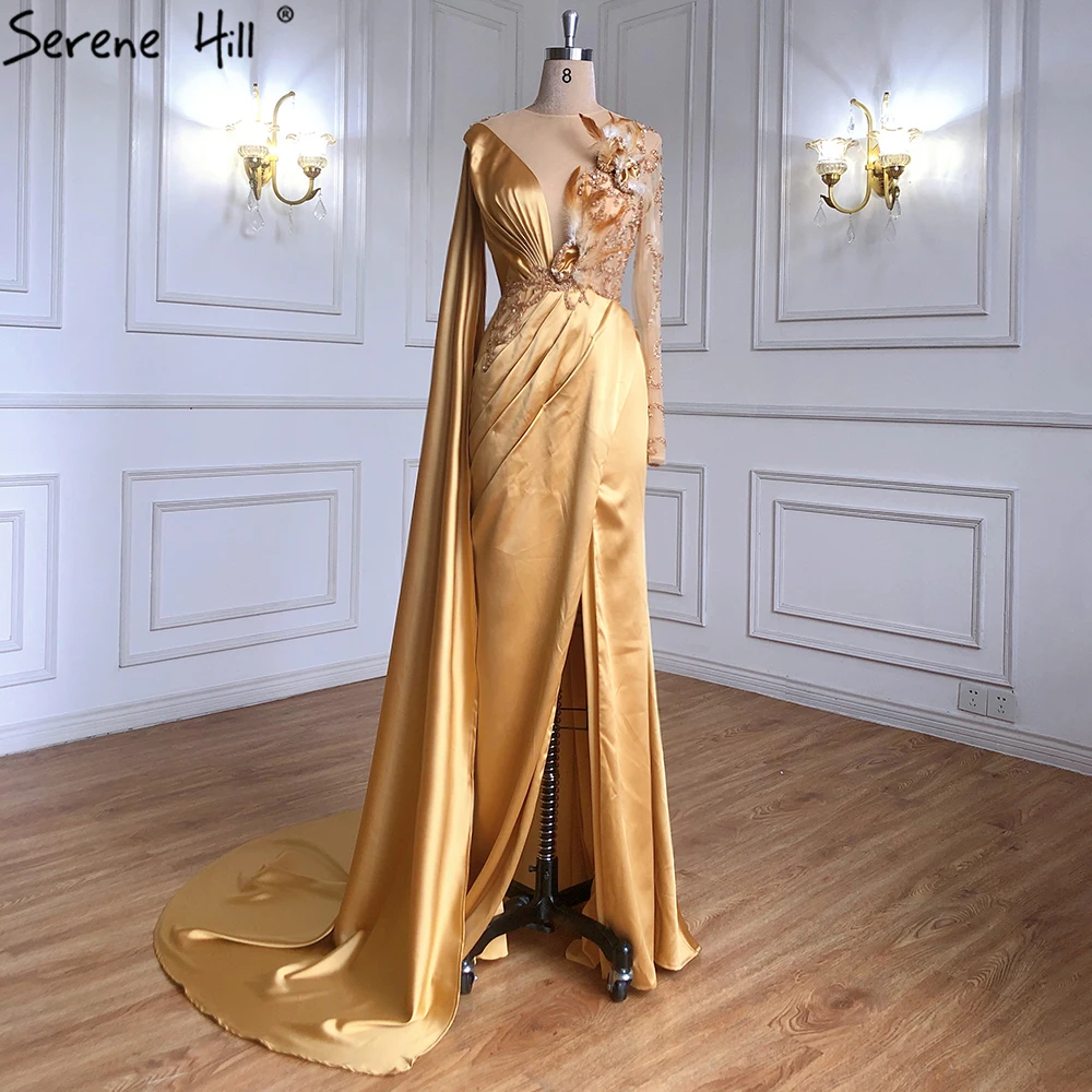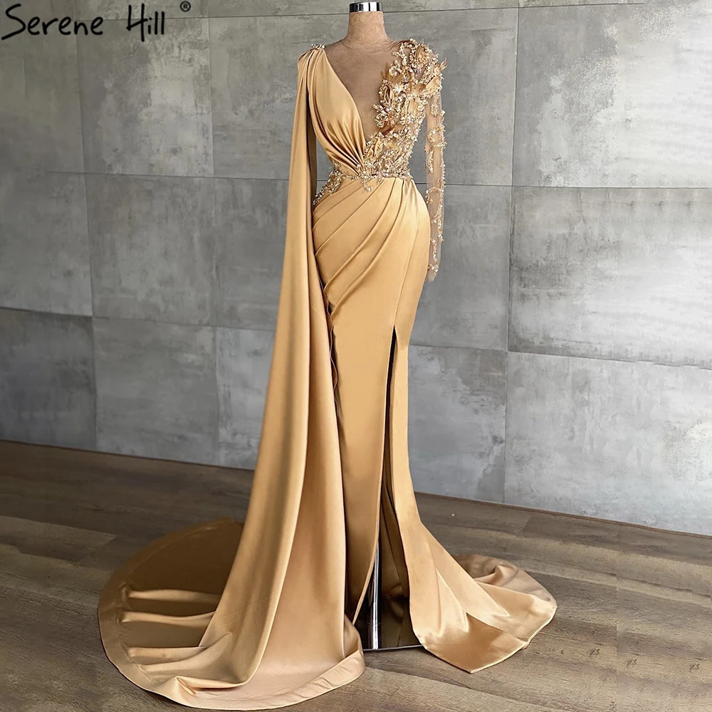Атласное Вечернее платье-Русалка Serene Hill, роскошное золотистое платье с бисером, с перьями, с разрезом, с одним рукавом, для официальной вечеринки, класси71183, 2022