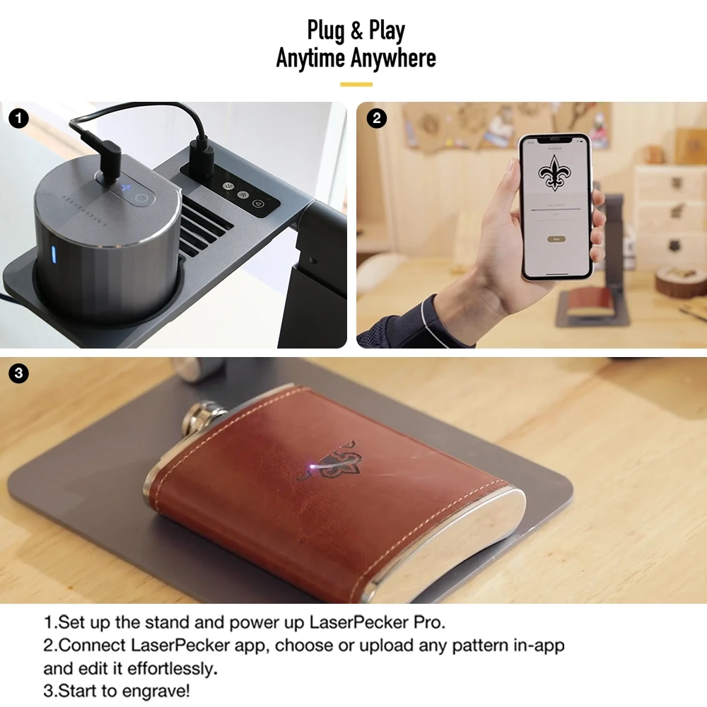 Встроенный 【портативный и сильный световой дизайн 】 компактный лазерный etcher можно взять с собой куда угодно и питание от внешнего аккумулятора; Без базового дизайна, без ограничений по высоте гравировки, поддерживаемые форматы файлов: поддерживаются JPG / BMP /PNG /G-код, Фото/вектор