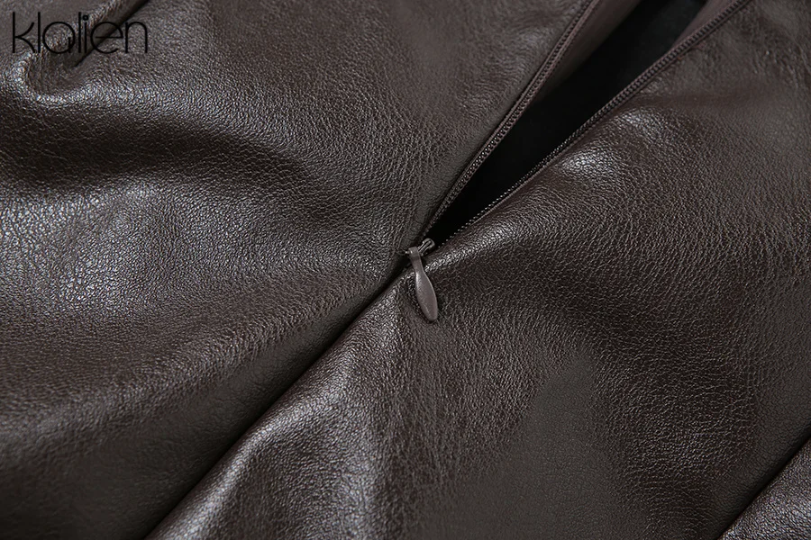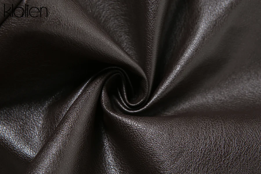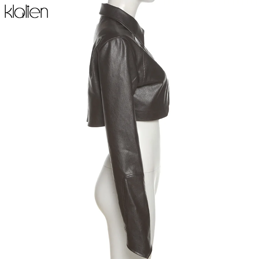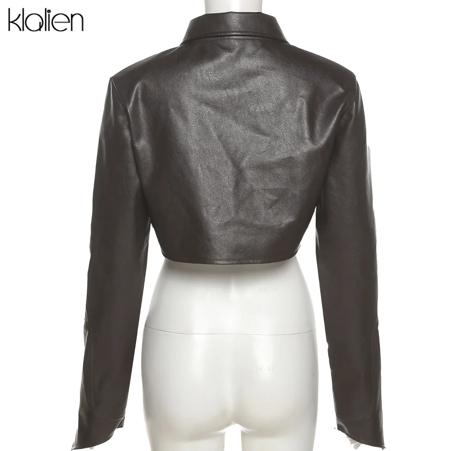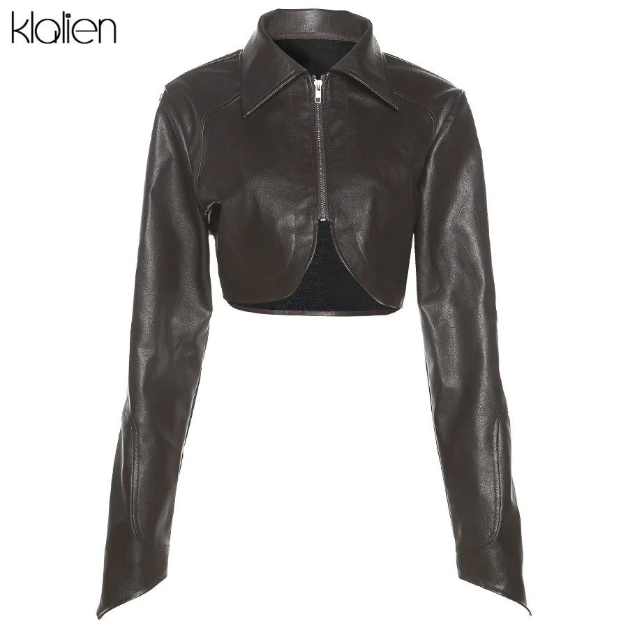 KLALIEN модное повседневное пальто с отложным воротником на молнии из искусственной кожи для женщин уличная одежда короткая куртка однотонная черная Клубная одежда Y2K