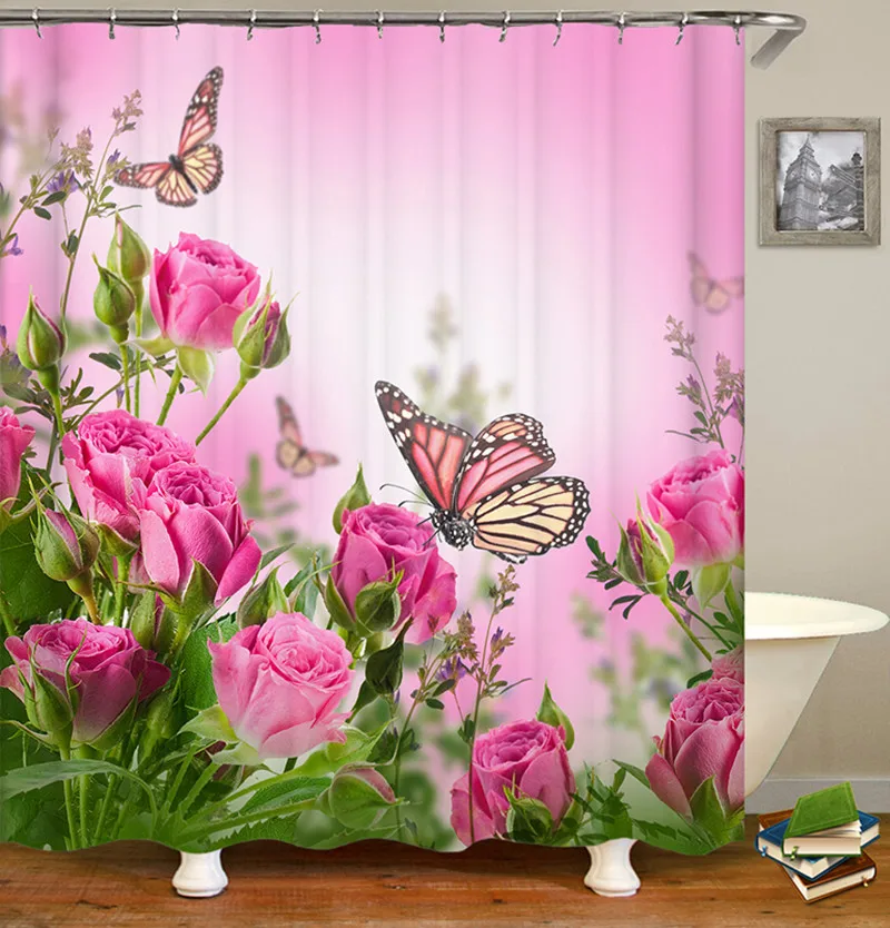 Набор из водонепроницаемой занавески для душа, с принтом бабочки, розы, нескользящий коврик для ванной, наборы ковриков, крышка для унитаза, декор для ванной