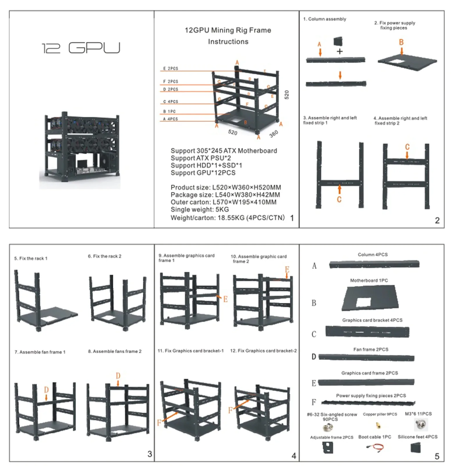 Размер изделия: как показано на картинкеРазмер материнской платы: максимум 305x245ммХарактеристики видеокарты: длина видеокарты <318 мм, расстояние между дисплеями 80 ммРадиатор: ЦП радиатор высота 135 ммПоддержка источника питания: Поддержка 2 ATX источников питания, длина менее 24 смУстройство хранения: SSD * 1 + HDD * 1Характеристики вентилятора: вентилятор 12 см * 8Материал изделия: кронштейн 1,0 мм, поверхности распылаСтандартные винты: шестигранная колонна 9 шт., винт для материнской платы 11 шт., шестигранный винт 90 шт.,1 x линия загрузки, нескользящая резиновая прокладка 4 шт.Упаковка: 540X380*42 ммВес брутто: 5 кг