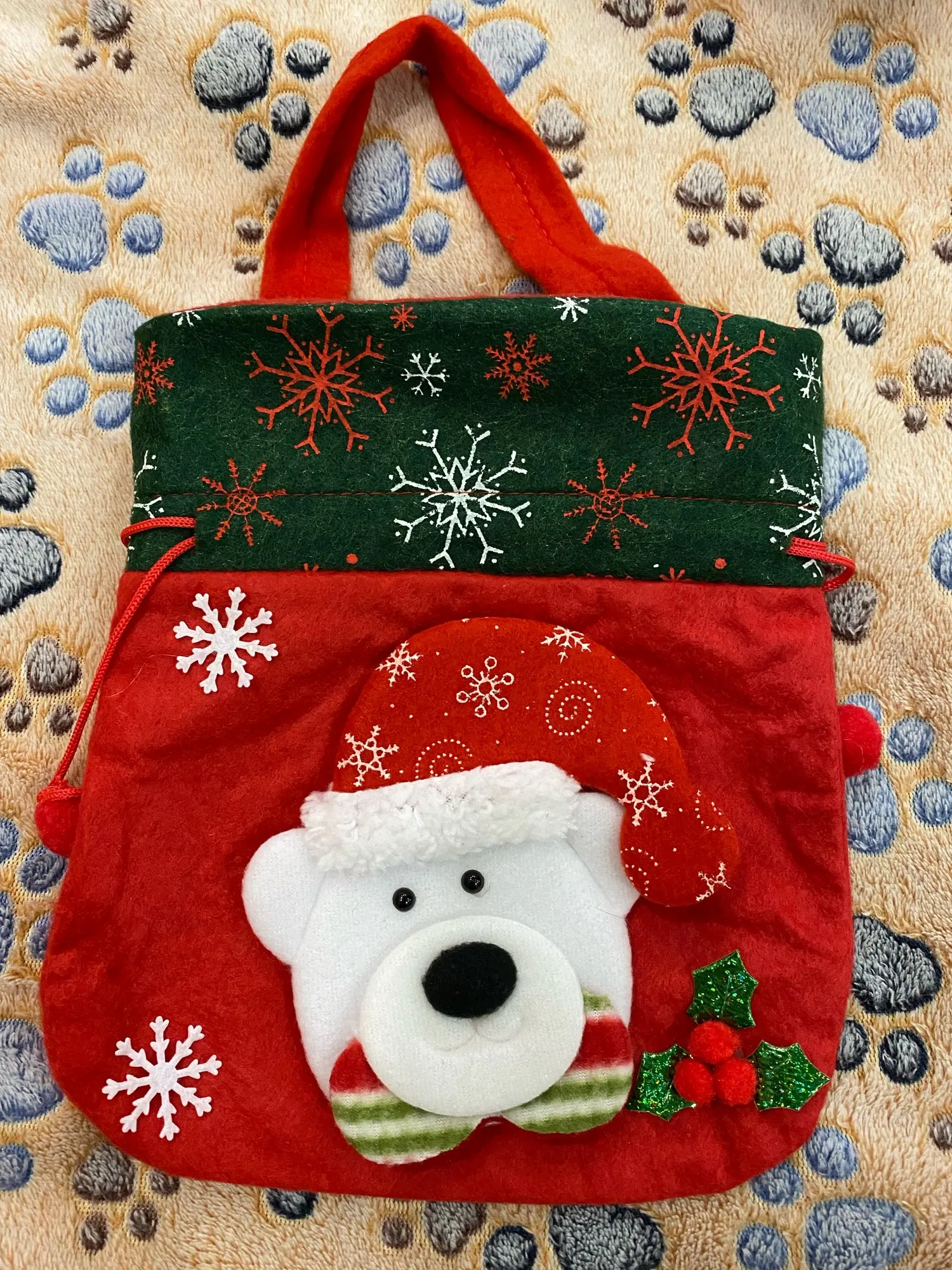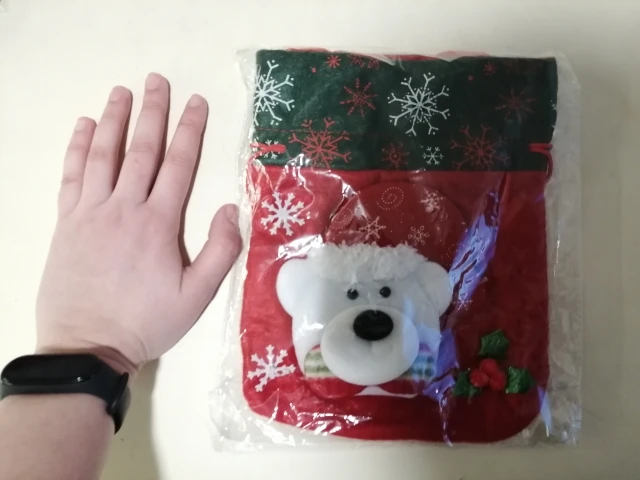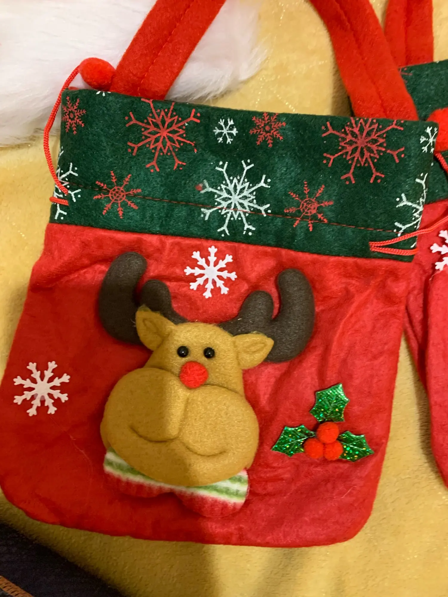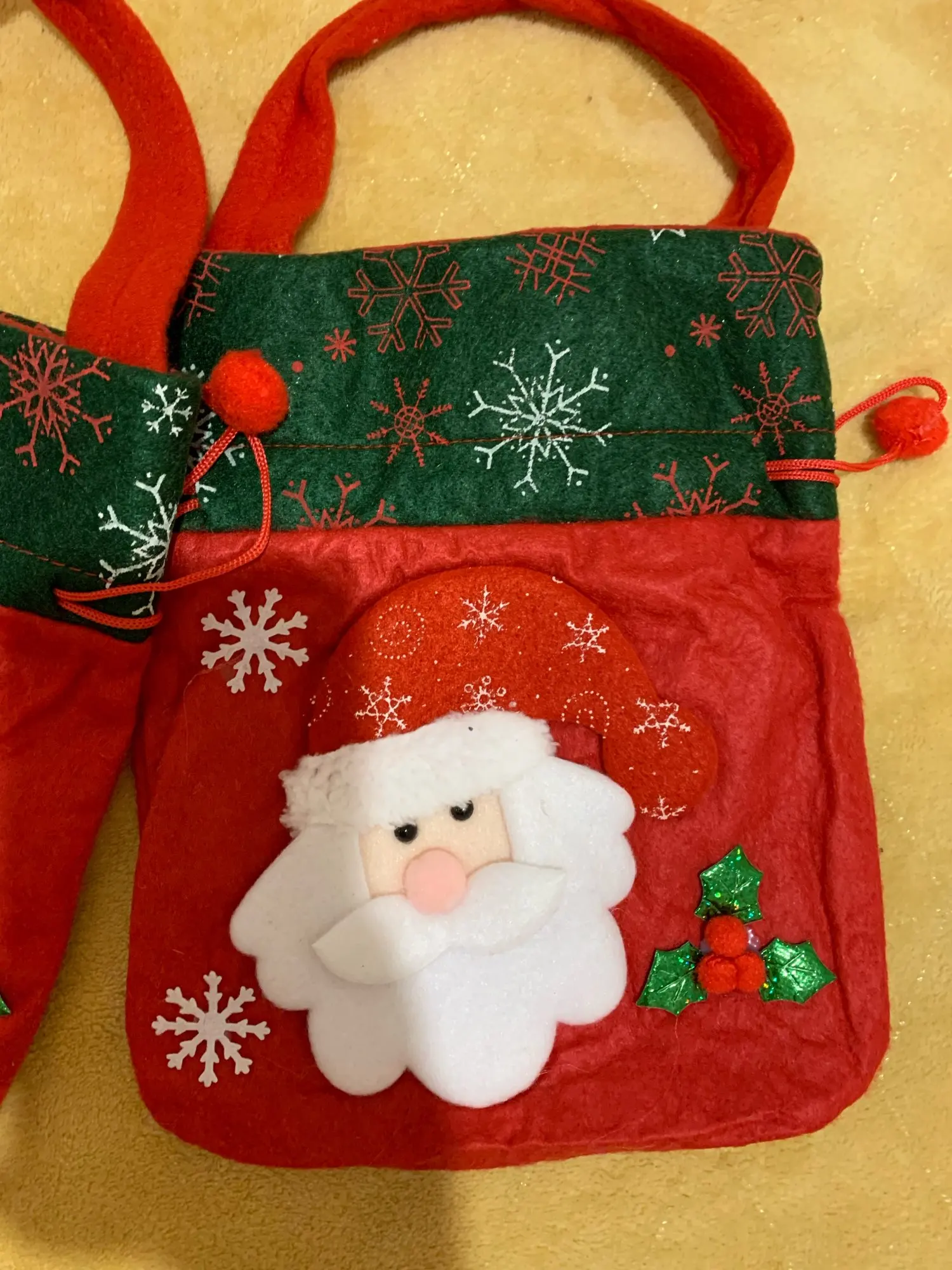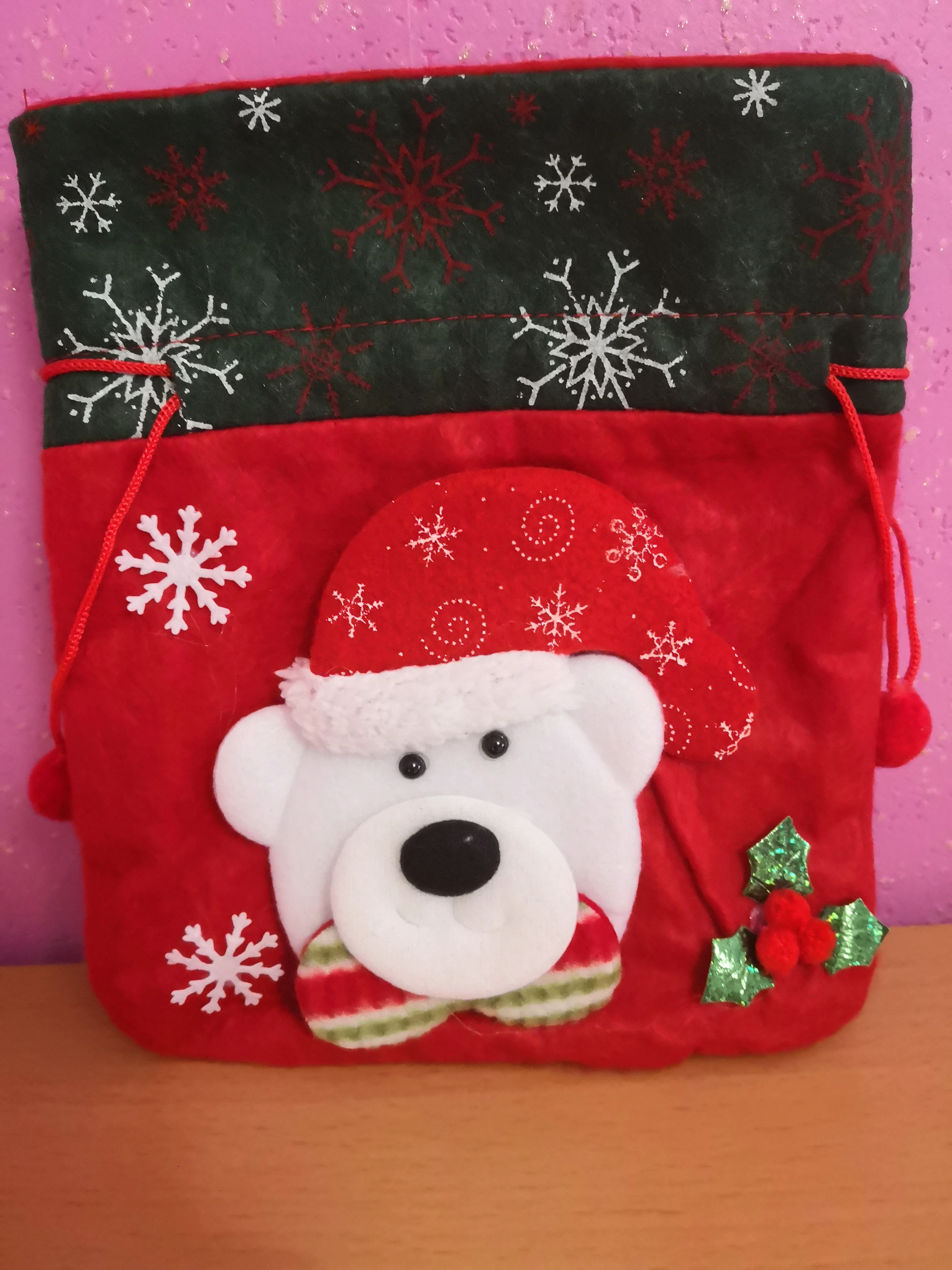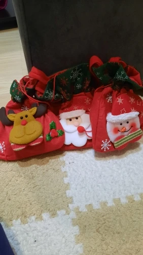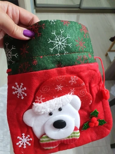 Очень классный мешочек, есть ручка и затягивается шнуром, так что ничего не выпадет. Украшен красиво. Хороший новогодний подарок.
