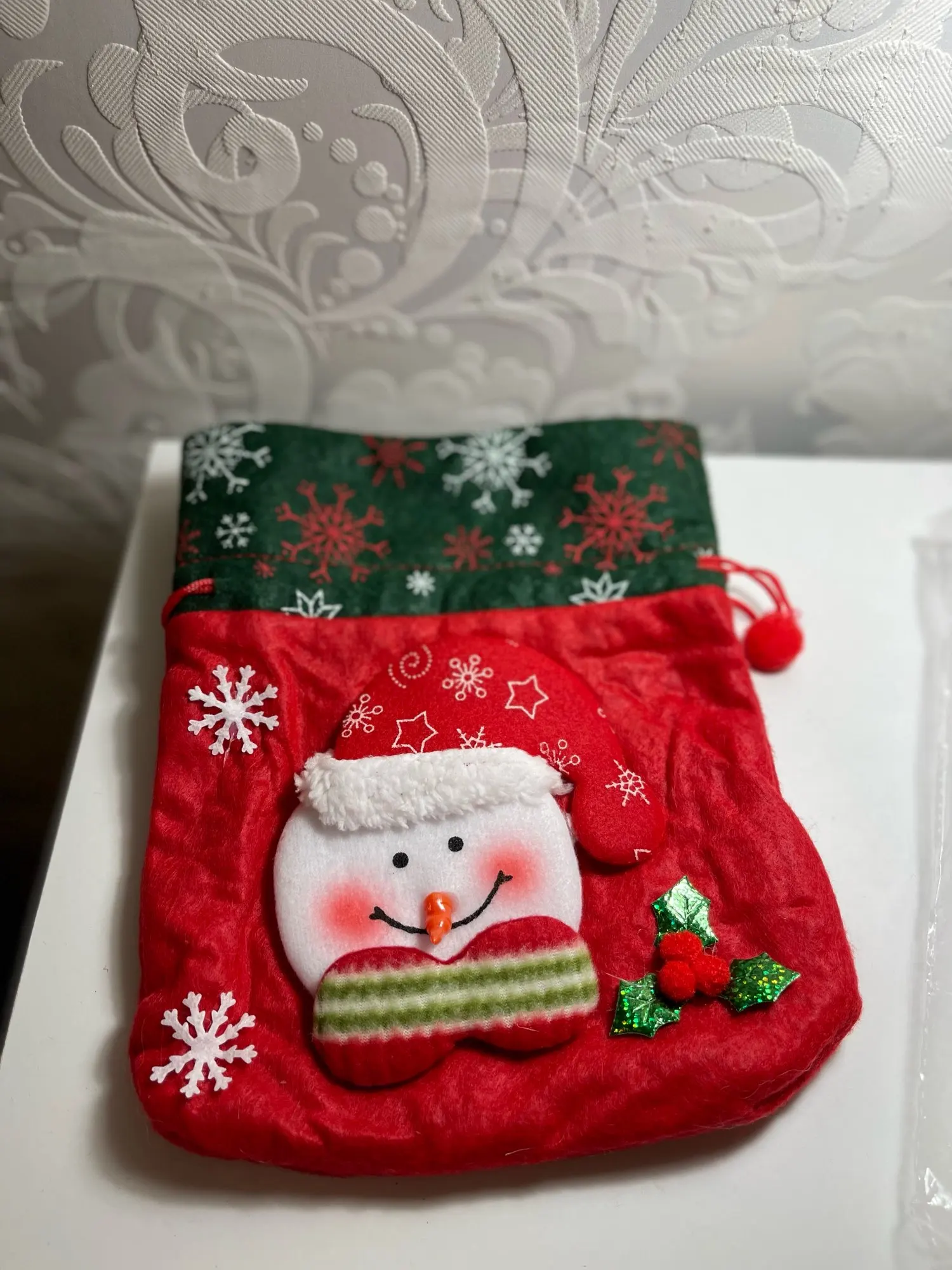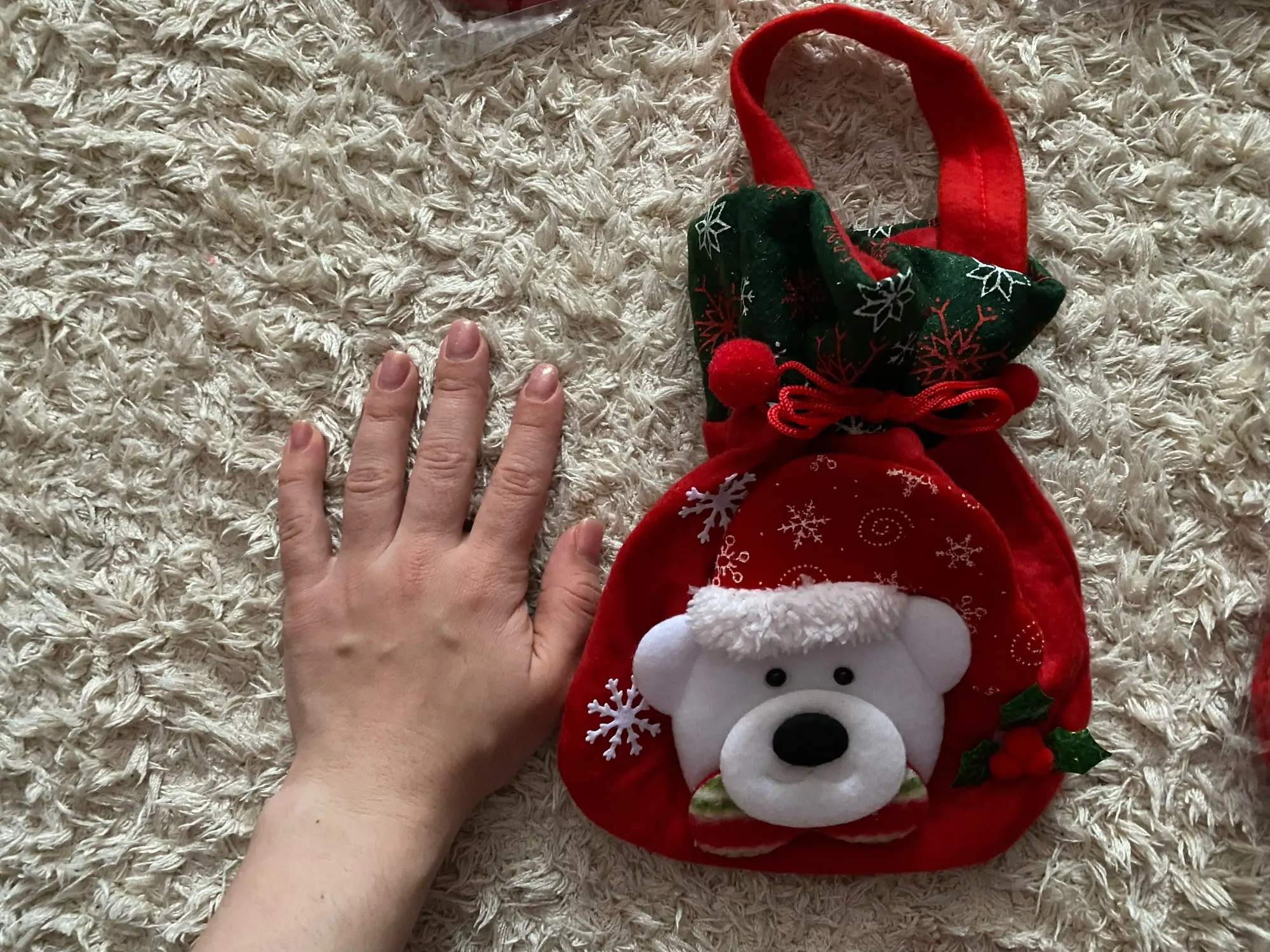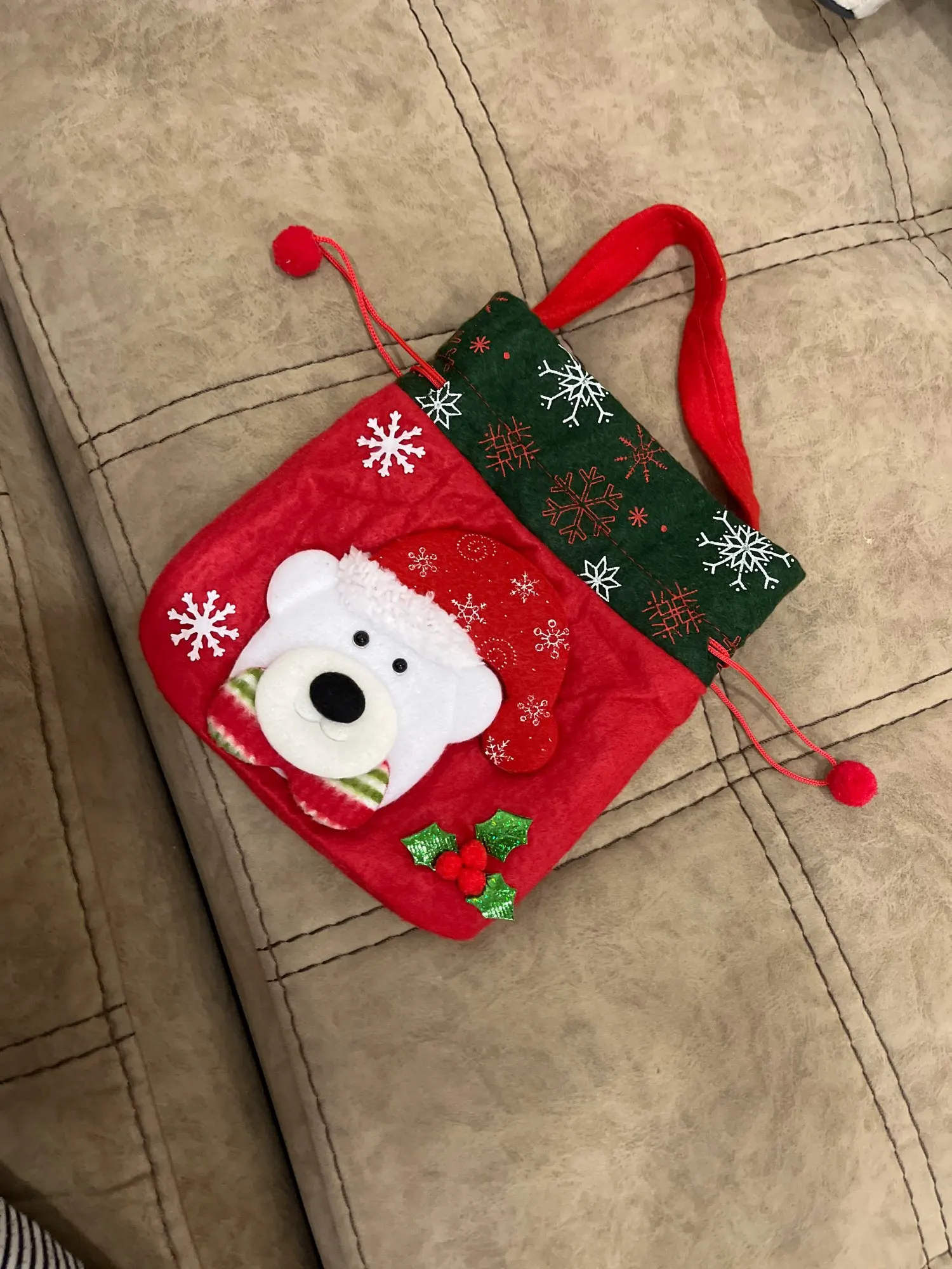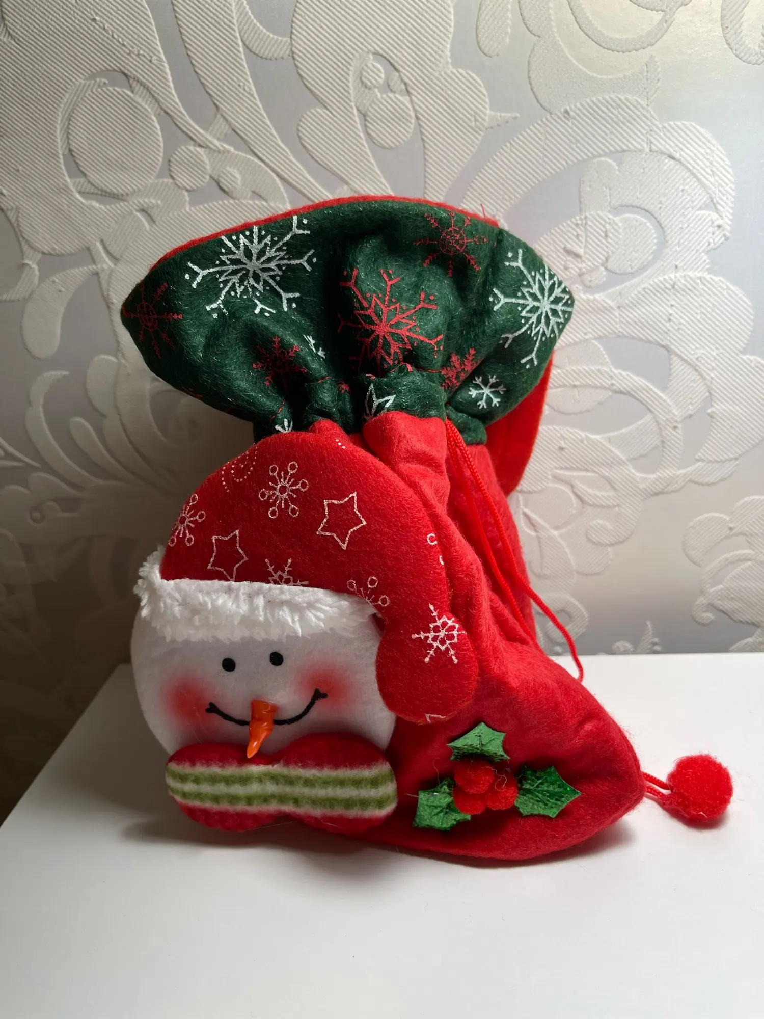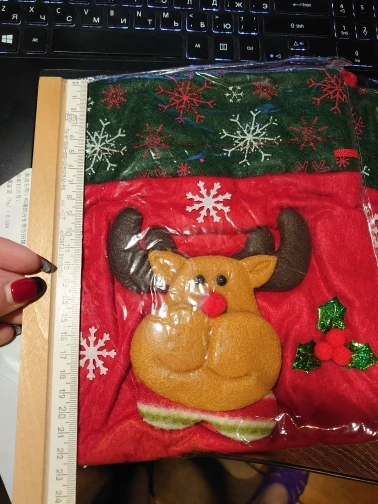 Очень классный мешочек, есть ручка и затягивается шнуром, так что ничего не выпадет. Украшен красиво. Хороший новогодний подарок.