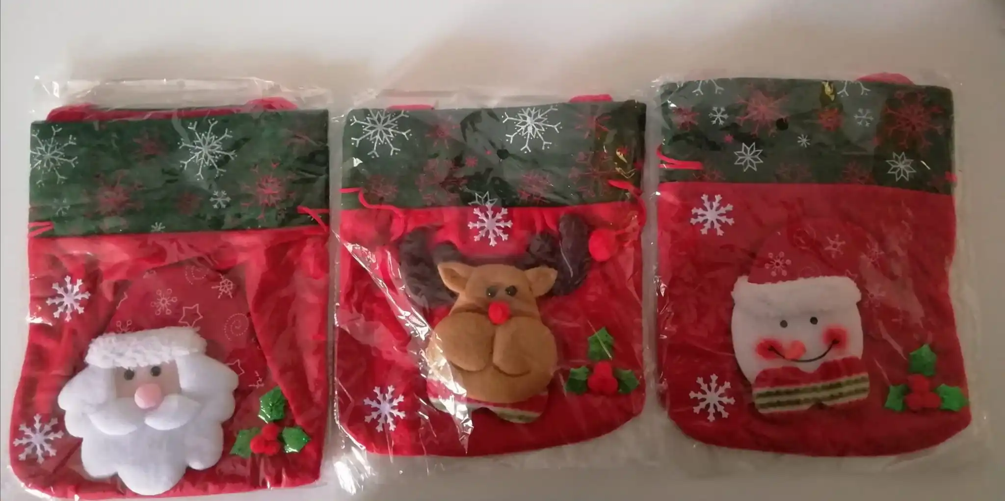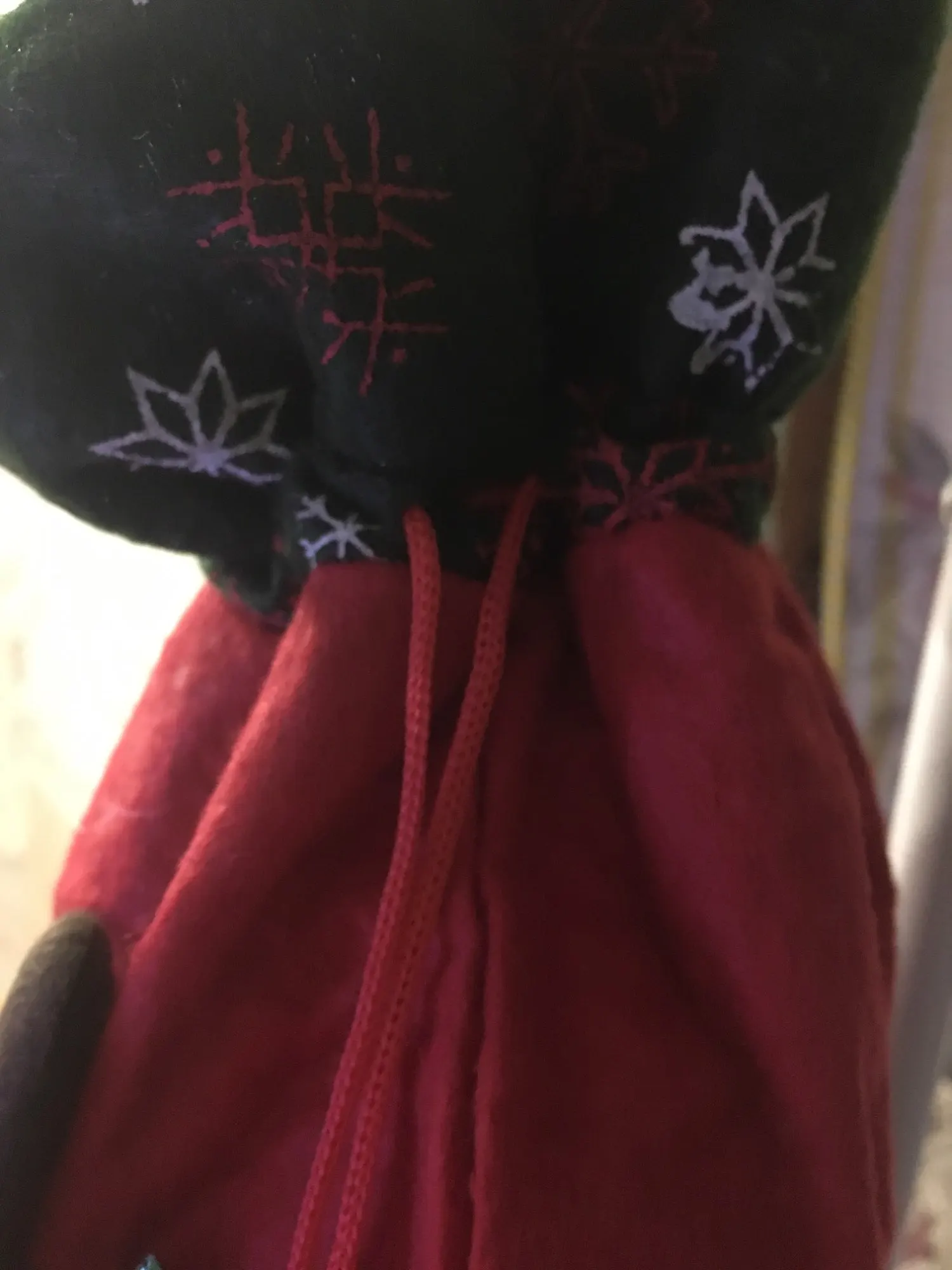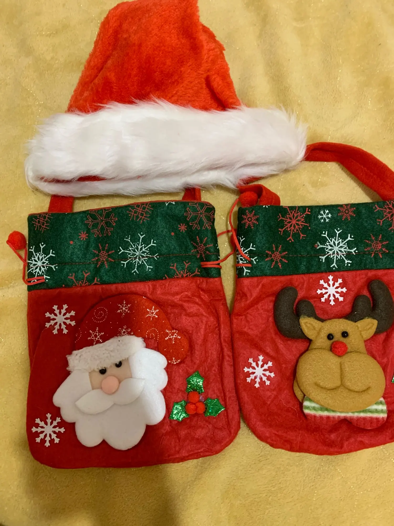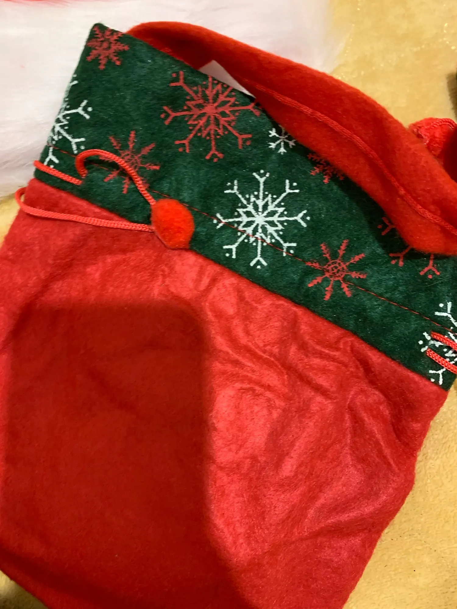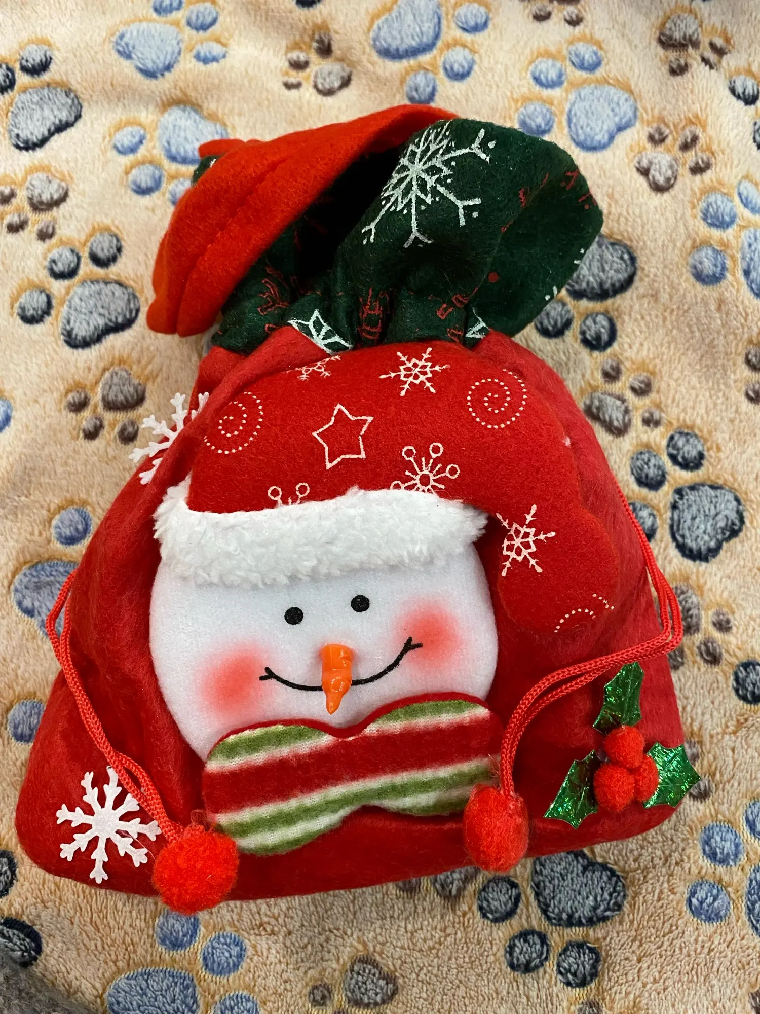 Очень классный мешочек, есть ручка и затягивается шнуром, так что ничего не выпадет. Украшен красиво. Хороший новогодний подарок.