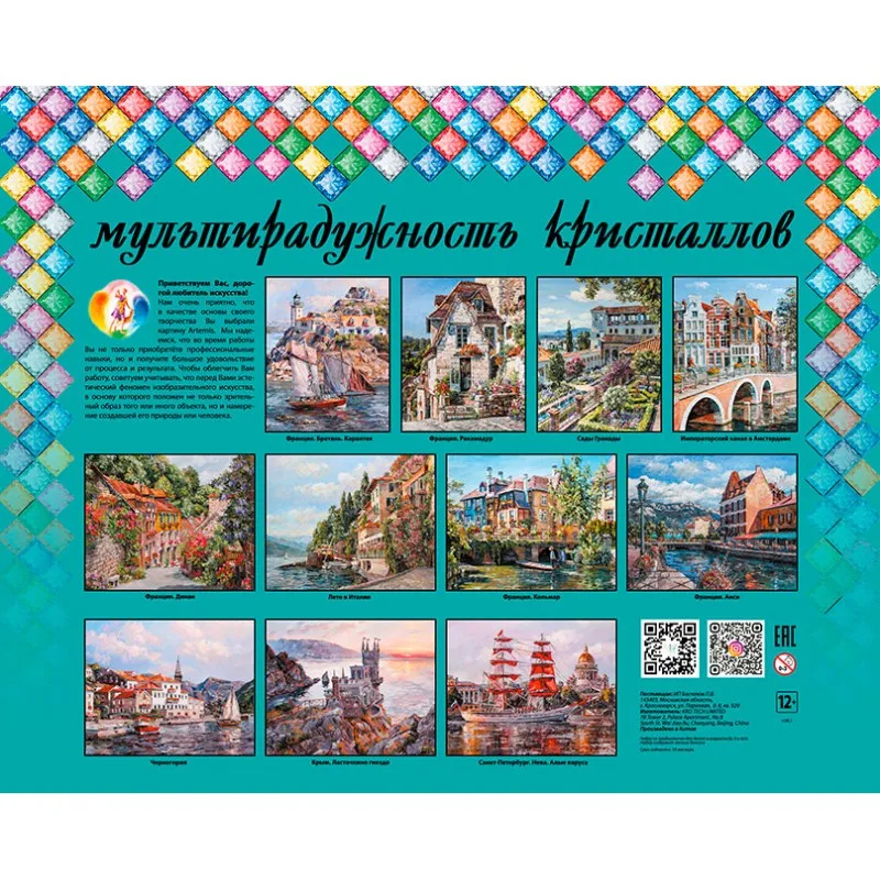 Отправьтесь в большое европейское путешествие вместе сюжетами от творческого коллектива Артемис. Создайте своими руками восхитительный пейзаж и вас ждет настоящее открытие - реальная красота мозаичной превзойдет самые большие ожидания. Для наилучшего результата сюжет специально доработан дизайнером и разложен на оптимальное количество цветов. Набор комплектуется качественными камнями на основе эпоксидной смолы, с огранкой по типу драгоценных камней, что дает возможность получить в результате прекрасную блестящую картину.