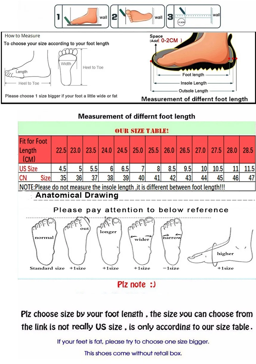 Мы отправляем только китайский размер или длину стопы; Пожалуйста, ориентируйтесь на длину вашей стопы, чтобы выбрать размер. 1. Например, длина стопы 27 см, я выберу американский размер 10 = Китайский размер 44.Обычно выбирайте на 1 размер больше, если нога немного широкая и толстая. 2. Размер не соответствует длине стельки или длине подошвы, это означает только длину стопы. 3. Из-за различных настроек дисплея и угла съемки цвет может немного отличаться от реального. Мы отправляем все без коробки.Длина стопы <длина стельки <длина подошвыДлина стельки не соответствует длине стопы. Чтобы лучше защитить стопу, на передней части стельки будет увеличена длина, а на задней-трехмерная.Американский размер 4,5 = Размер 35 = стопы Длина 22,5 смАмериканский Размер 5 = РАЗМЕР 36 = длина стопы 23 смАмериканский размер 5,5 = размер 37 = стопы Длина 23,5 смАмериканский размер 6 = размер 38 = длина стопы 24 смАмериканский размер 6,5 = размер 39 = стопы Длина 24,5 смАмериканский размер 7 = размер 40 = длина стопы 25 смАмериканский Размер 8 = размер 41 = стопы Длина 25,5 смАмериканский размер 8,5 = размер 42 = ног Длина 26 смАмериканский размер 9,5 = размер 43 = стопы Длина 26,5 смАмериканский размер 10 = размер 44 = длина стопы 27 смАмериканский Размер 10,5 = Размер 45 = стопы Длина 27,5 смАмериканский размер 11 = размер 46 = длина стопы 28 см