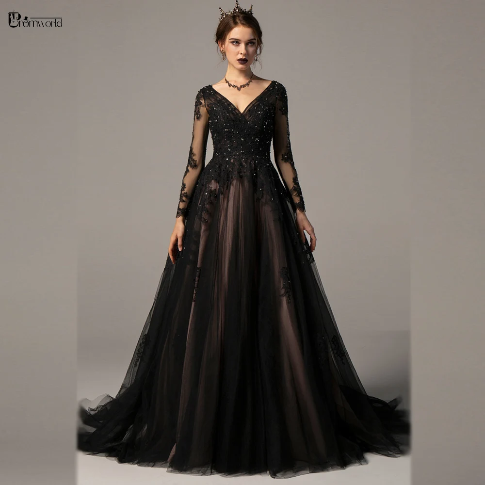 Женское черное платье с длинным рукавом, сексуальное платье для выпускного вечера с V-образным вырезом и кружевом, расширяющееся книзу, 2021