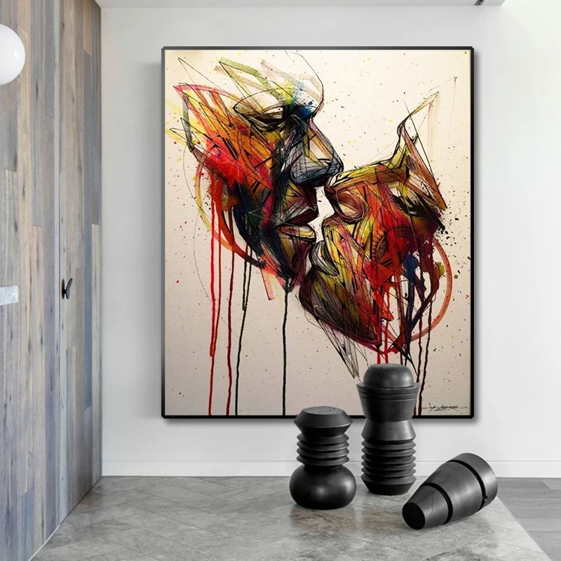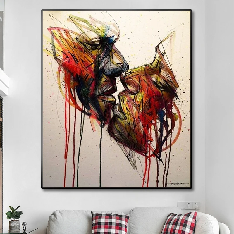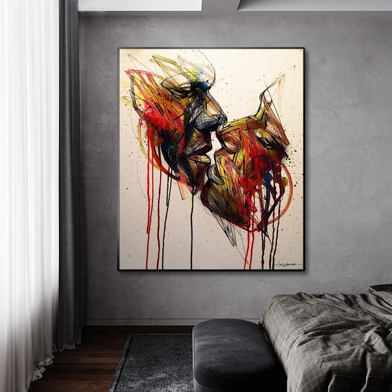 Абстрактная картина для влюбленных, поцелуй, холст, граффити, искусство на стену в уличном стиле, картина для гостиной, домашний декор, квадраты