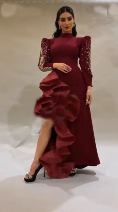 Verngo сдержанные бордовые вечерние платья с высоким воротом с пышными длинными рукавами бусинами оборками разрезом платья для выпускного вечера саудовские арабские Женские официальные платья