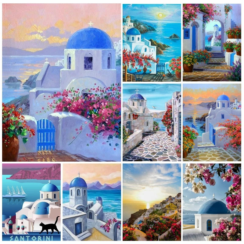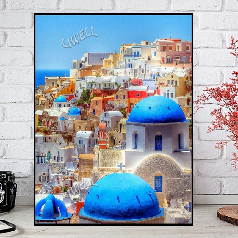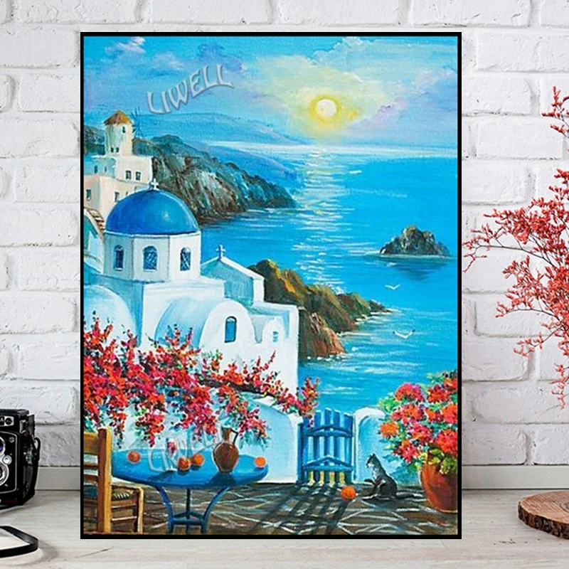 5d алмазная живопись, Санторини, сине-белый церковный искусство, греческий остров, пейзаж, мозаика, Набор для вышивки крестиком, постер для домашнего декора