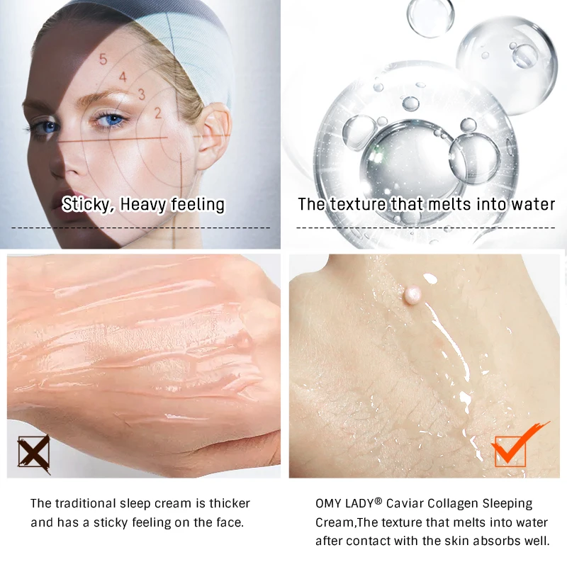 OMY LADY®Икра коллаген спящий крем, текстура, которая плавится в воду после контакта с кожей хорошо впитывает.