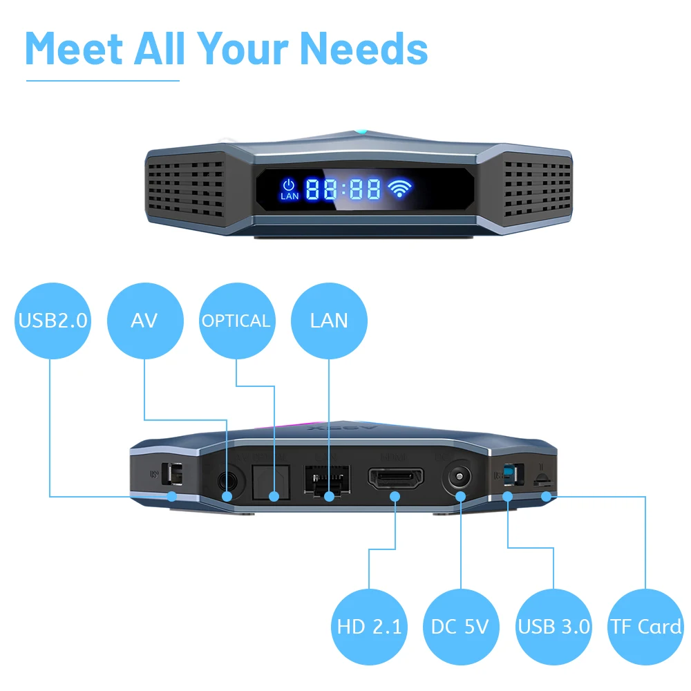 Процессор: четырехъядерный ARM Cortex-A55 (Amlogic S905X4)Графический процессор: ARM Mali-G31;ОС: Android 11,0;WIFI IEEE 802,11 a/b/g/n/ac (2,4G/5G)+ WithBT5.0H.265, 8K @ 24 кадров в секунду, 4K @ 60 кадров в секунду, HD 2,1, USB3.0;AV1, RGB свет и обои СменныеРазъем для карты памяти SDSC/SDHC/SDXCVoide 4K/8KA: 2G + 16G + Dual Wifi + WithBT5.0 + 100MB: 4G + 32G + Dual Wifi + WithBT5.0 + 100MC: 4G + 64G + Dual Wifi + WithBT5.0 + 100MD:4G + 128G + Dual Wifi + WithBT5.0 + 100M