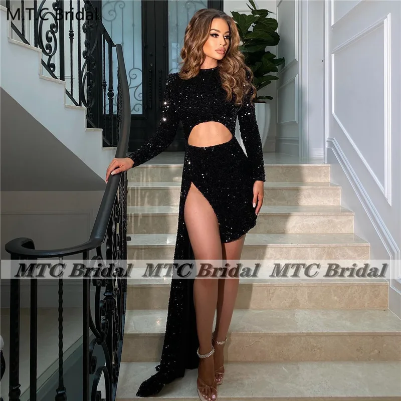 Женское вечернее платье с длинным рукавом, синее блестящее короткое...
