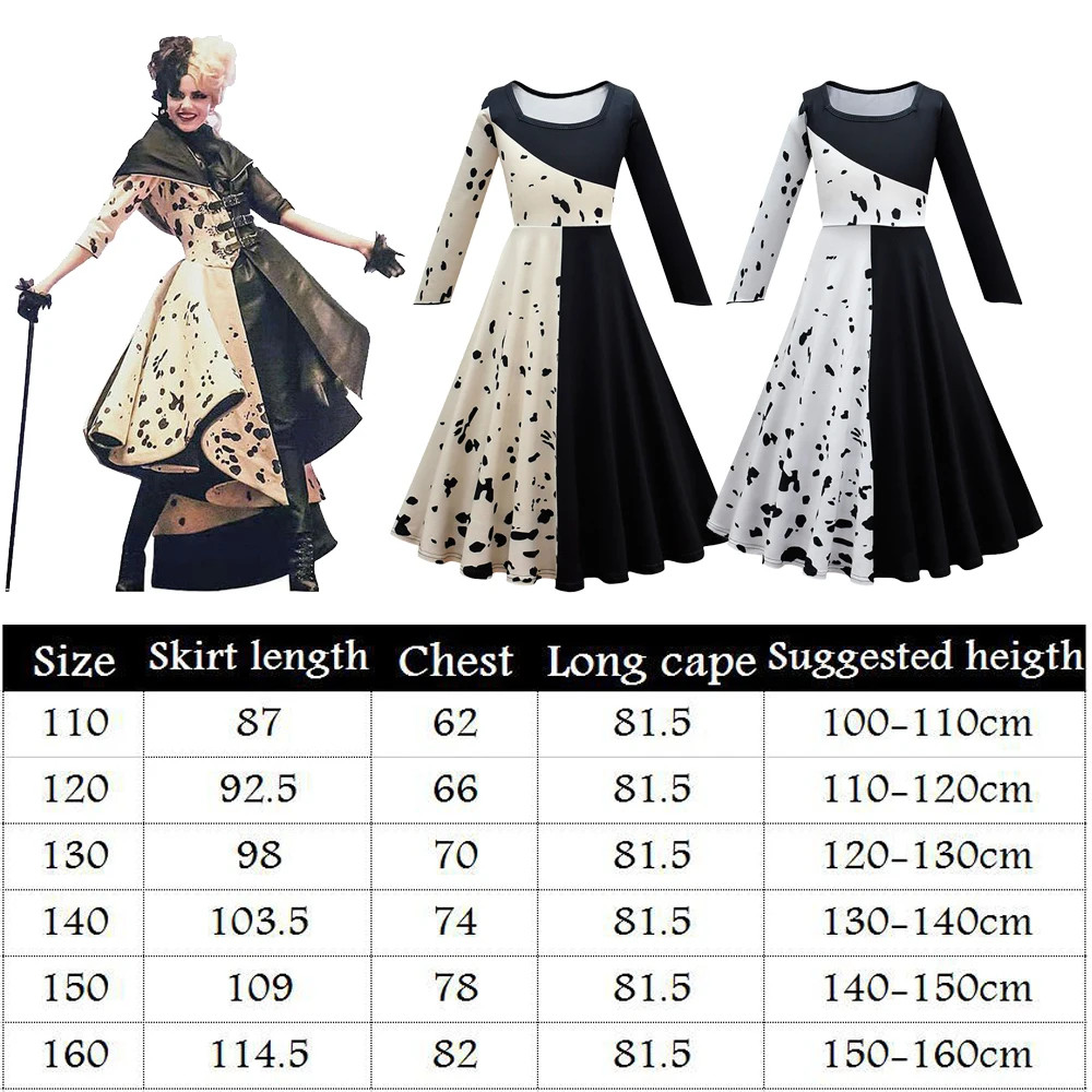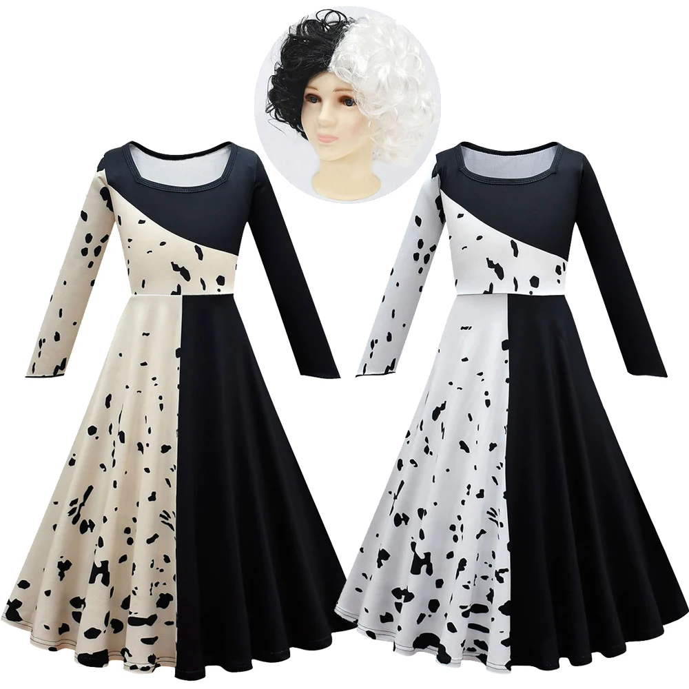 Новинка 2021, костюм для косплея злых мадам кроелла де Виль из фильма, детское платье, черное, белое, искусственное платье для вечеринки с накидкой, парик