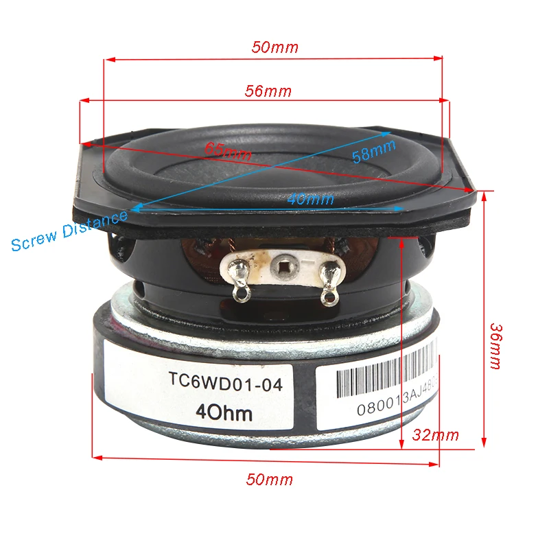 Полнодиапазонный динамикДиапазон мощности: 10-20 ВтИмпеданс: 4ΩЧувствительность: 90 дБРасстояние между отверстиями для диагонального винта: 58 ммКрышка динамика: 56 ммВысота динамика: 36 ммДиаметр магнита (основания): 50 ммДля получения более подробной информации о размерах, пожалуйста, ознакомьтесь с изображениемКонструкция динамика: 50 мм магнитное основание + резиновый край + композитная вата + Железный кронштейн