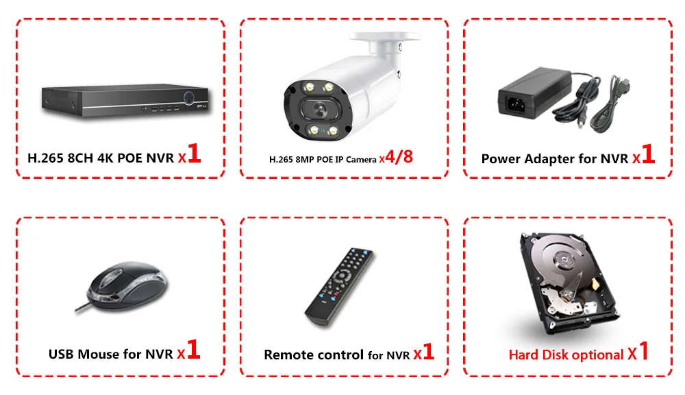 1 сетевой видеорегистратор H.265 8CH 4K & 8MP POE NVR;4/8 X H.265 HD POE аудио 8.0MP IP Крытый Открытый ИК День ночного видения атмосферостойкие камеры;1 x Блок питания для NVR;1 х USB мышь для NVR;1 компакт-диск программного обеспечения для NVR;1 пульт дистанционного управления для NVR;Жесткий диск опционально!