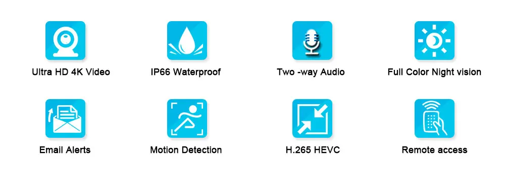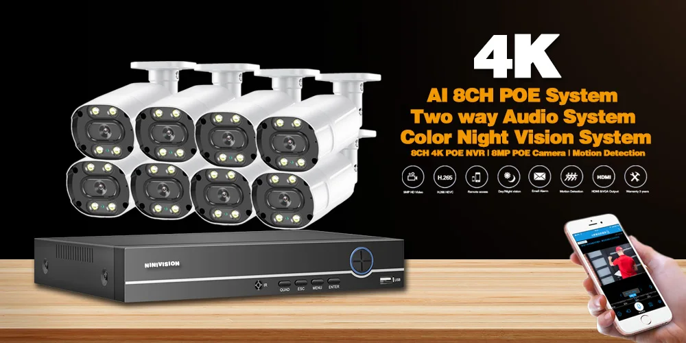 1. Все наши NVR и камеры являются реальными H.265 4K 8MP, NVR может поддерживать 8MP и 4K max, вы можете подключить 720p,1080p,3mp,4mp ,5mp, камеры 8mp & 4k с нашим POE NVR;2. Наш NVR поддерживает распознавание лиц, умное воспроизведение лица, обеспечивает ультра высокое разрешение видео наблюдения, обеспечивая максимальную детализацию и четкость в наличии;3. Наш NVR и камеры поддерживают расширенное H.265 Сжатие видео, питание через Ethernet, подключи и работай, простота установки;4. Все камеры встроены в микрофон и динамик, поддержка двухсторонней аудиозаписи;5. Все камеры имеют металлический корпус, IP66 водонепроницаемый, подходит для внутреннего и наружного использования, надежная Домашняя безопасность;6. Все камеры поддерживают Ultra HD Full Color Day Night Vision;7. Поддержка обнаружения движения, оповещения по электронной почте, воспроизведения видео и многоязычности;8. Поддержка Android,Iphone,Ipad,PC,VMS,P2P view;9. Удаленный доступ в любом месте, в любое время;10. Подходит для всех видов мест применения;