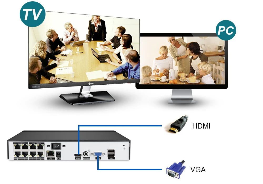 Просмотр на HD монитореЛегко отображать видео через порт HD вашего монитора компьютера, чтобы в полной мере воспользоваться четкостью системы безопасности (кабель HD не входит в комплект)Просмотр по телевизору или монитору ПКДля дополнительного удобства NVR также поставляется с подключениями VGA и HD для стандартных вариантов просмотра разрешения. (кабель VGA или BNC к RCA не входит в комплект)