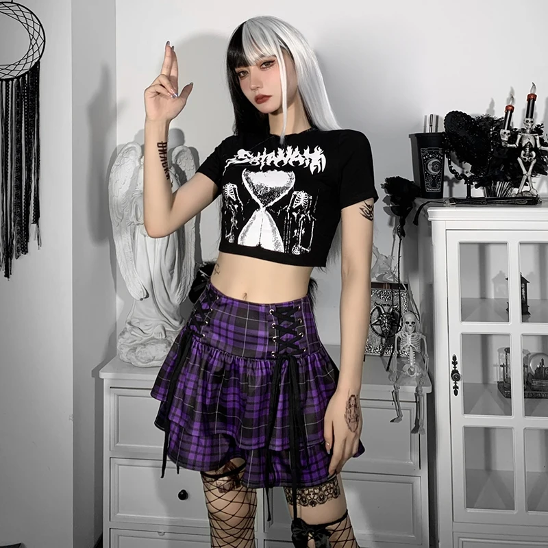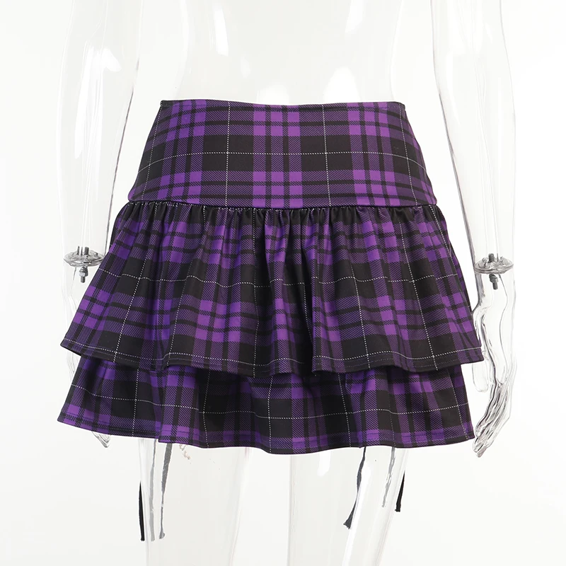 Фиолетовая бандажная клетчатая мини-юбка Y2K в стиле Харадзюку Kwaii, школьная юбка в стиле пэчворк с завышенной талией, Женская юбка с вышивкой