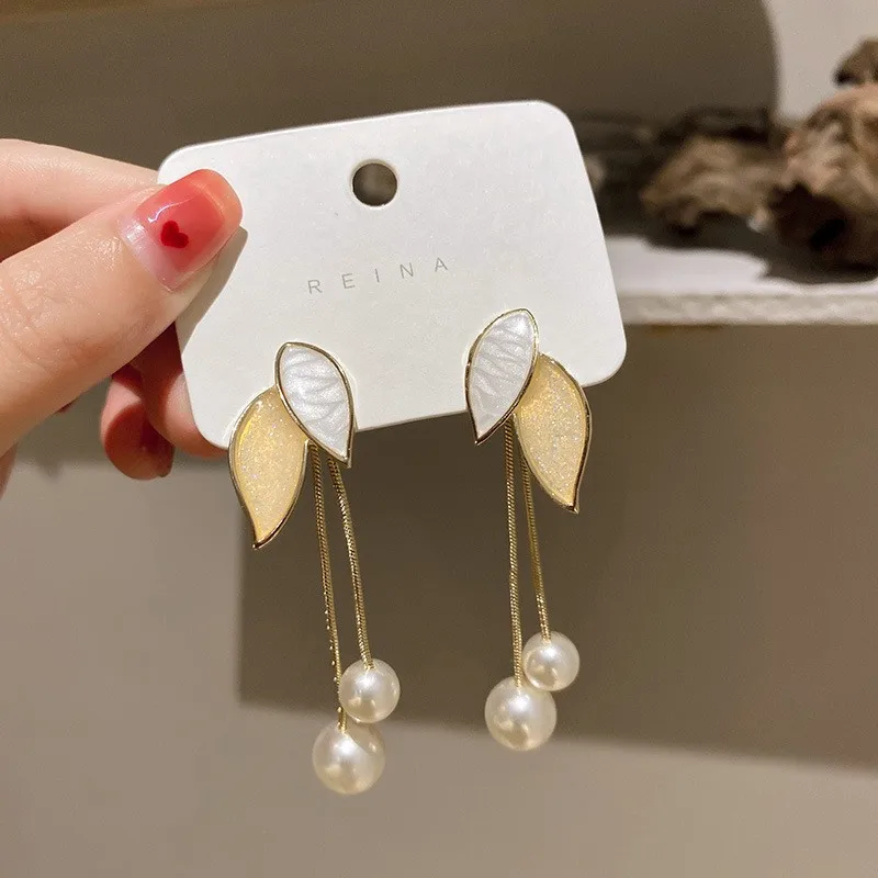 Корейские серьги, Модная бижутерия, длинные массивные серьги с имитацией жемчуга, листьев и кисточками, женские свадебные серьги оптом, серьги
