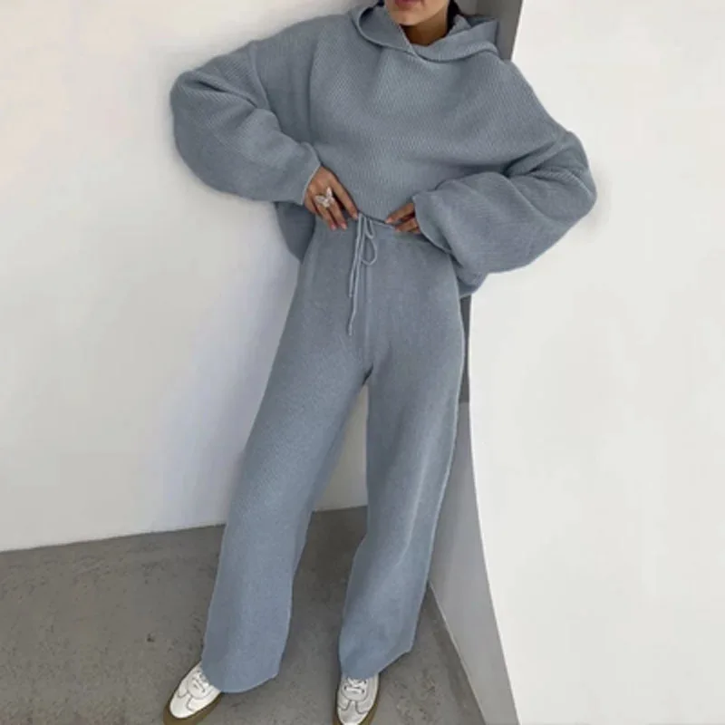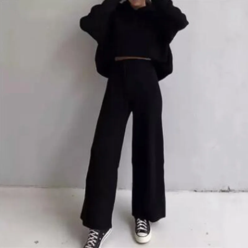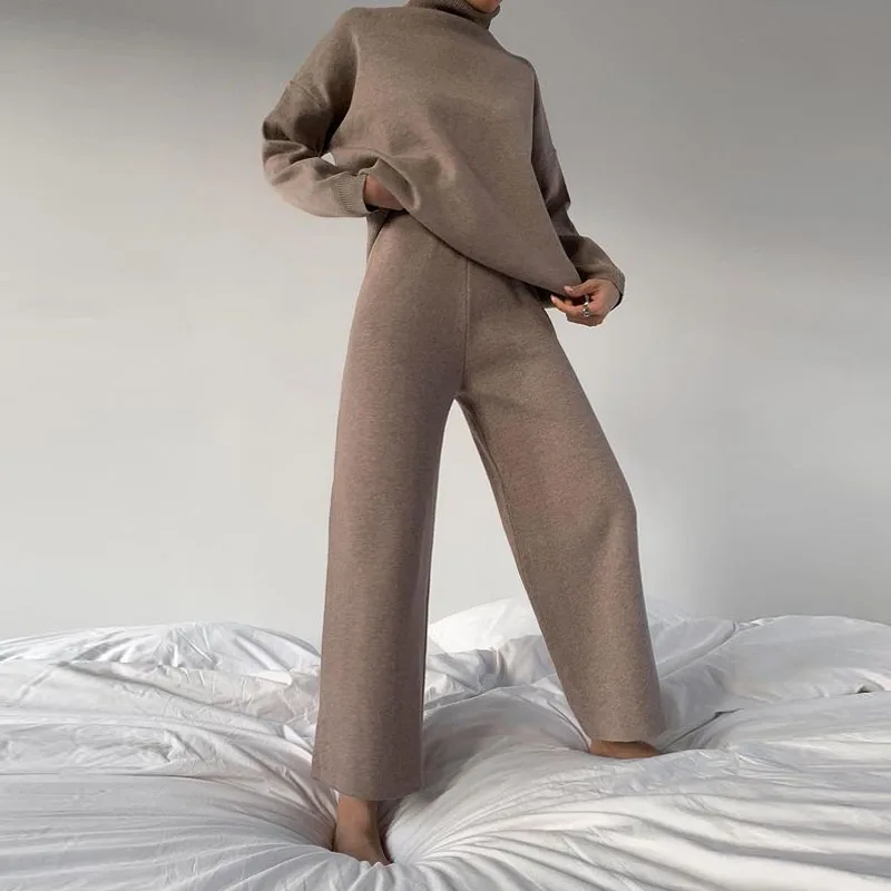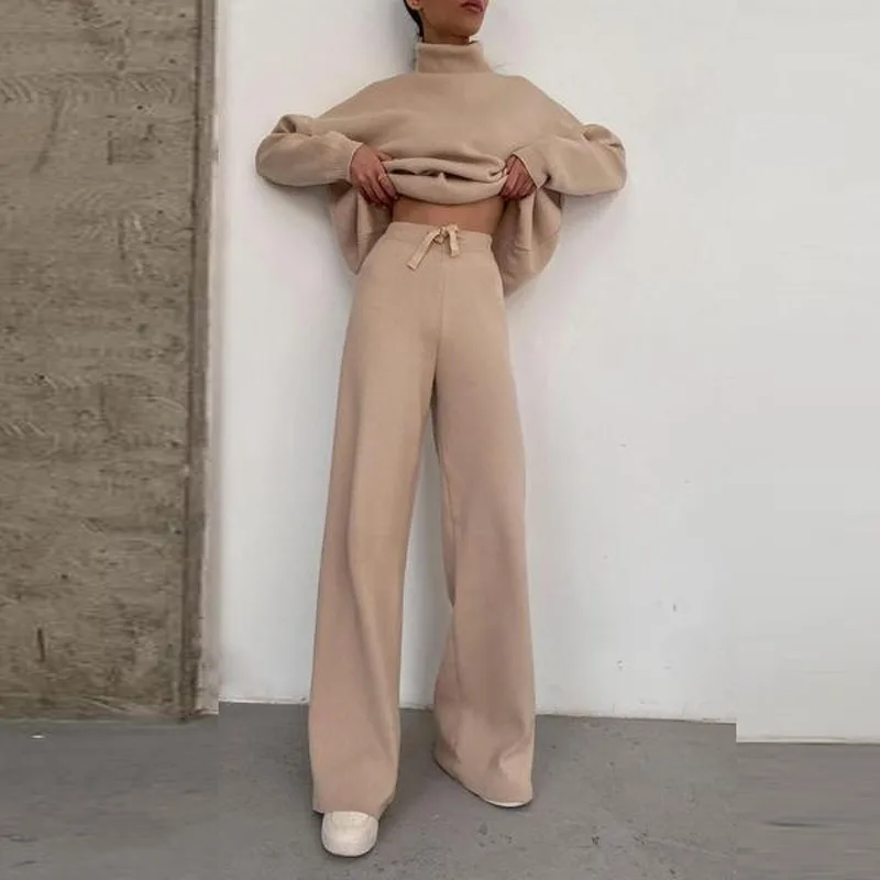 Женский вязаный комплект из 2 предметов, пуловер с высоким воротником и брюки с эластичным поясом, повседневный однотонный мягкий костюм для дома, весна-осень