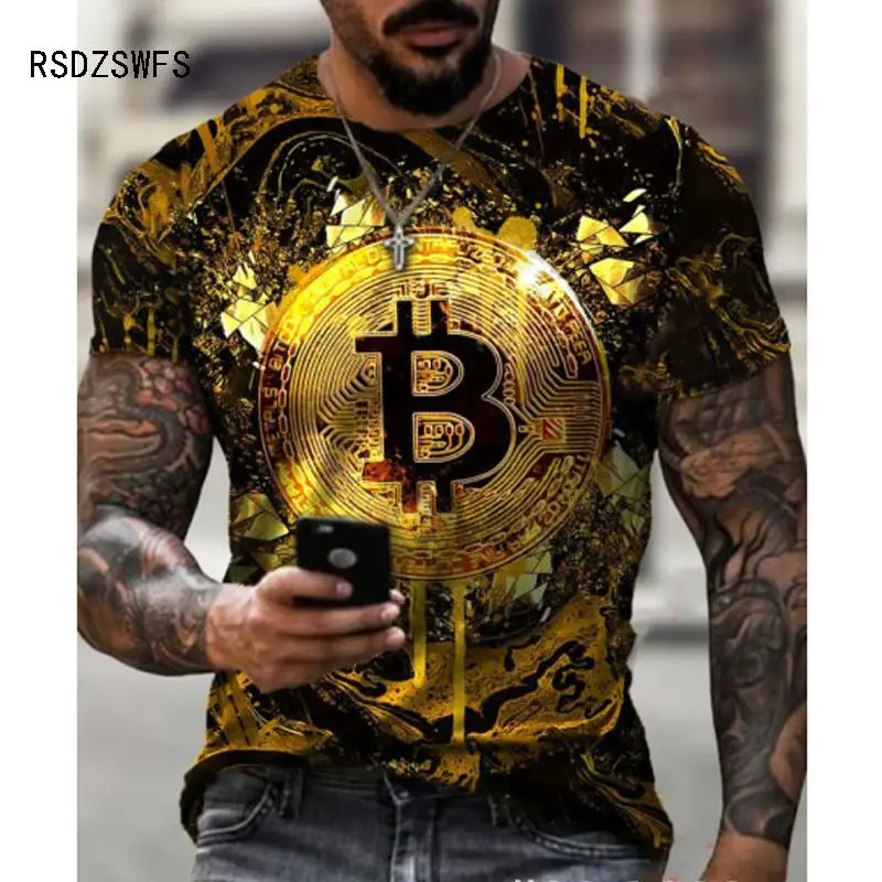Новинка лета 2021, Мужская свободная футболка с коротким рукавом, 3d принт биткоинов, тонкий пуловер с круглым вырезом, мужская повседневная Уличная одежда