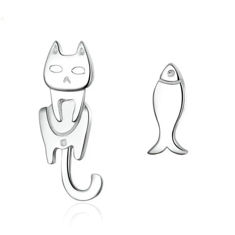 Новые Индивидуальные асимметричные серьги в виде кошки и рыбы, сере...