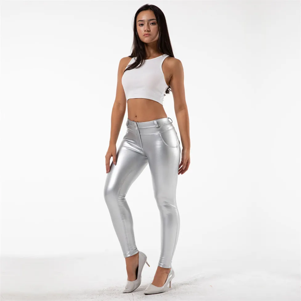 Кожаные леггинсы Melody с обычной талией и высокой талией, растягивающаяся ткань, очень мягкая и удобная, вы можете назвать их серебристыми кожаными джинсами, кожаными леггинсами с покрытием, блестящими брюками из искусственной кожи