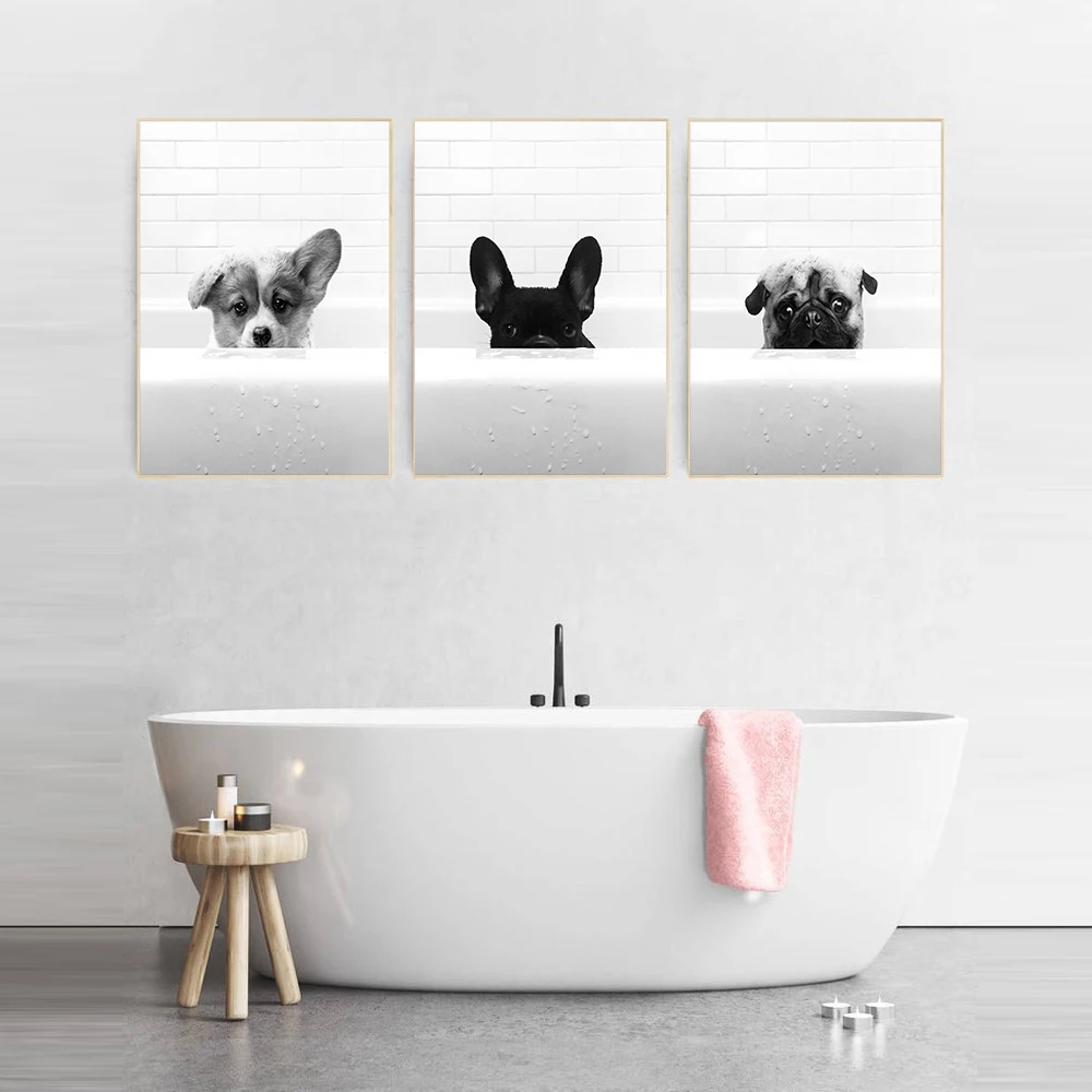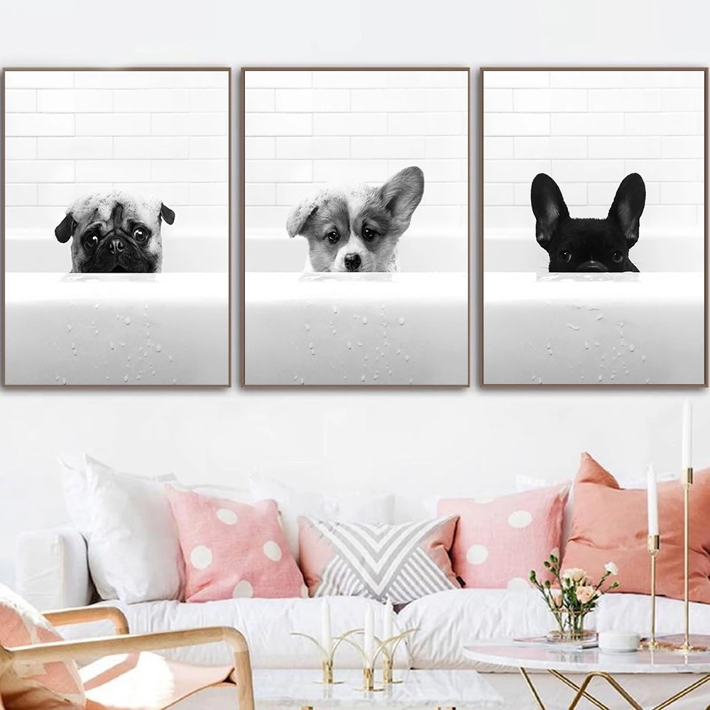 Картина на холсте три собаки в ванной, настенные плакаты и принты в скандинавском стиле, настенные картины для гостиной, украшение без рамки