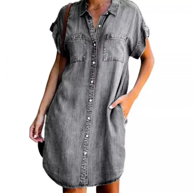 Синее платье-рубашка с коротким рукавом и воротником-стойкой, на пуговицах, 5XL, однотонное ТРАПЕЦИЕВИДНОЕ джинсовое платье-рубашка с рукавом реглан, повседневное серое ретро-платье с карманами, 17139