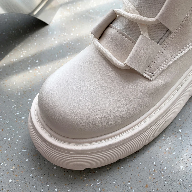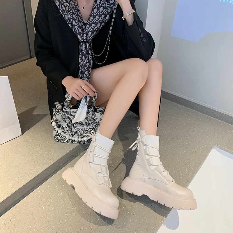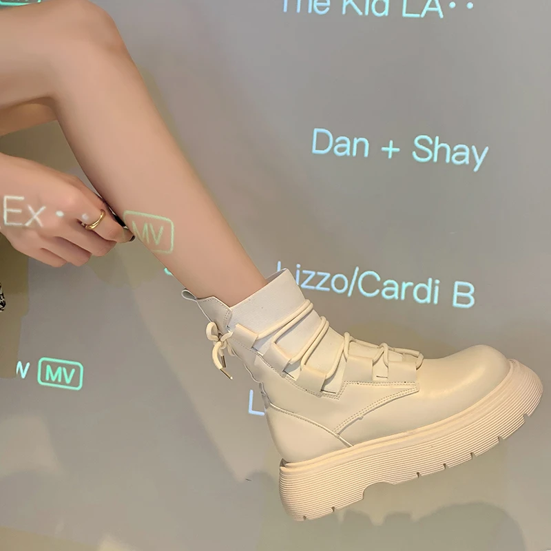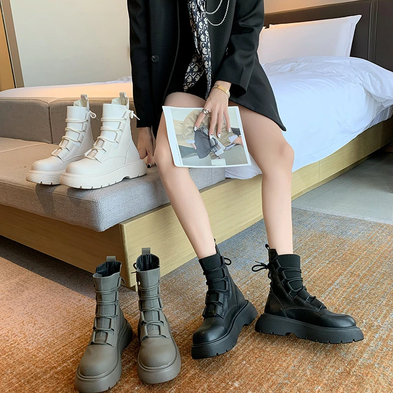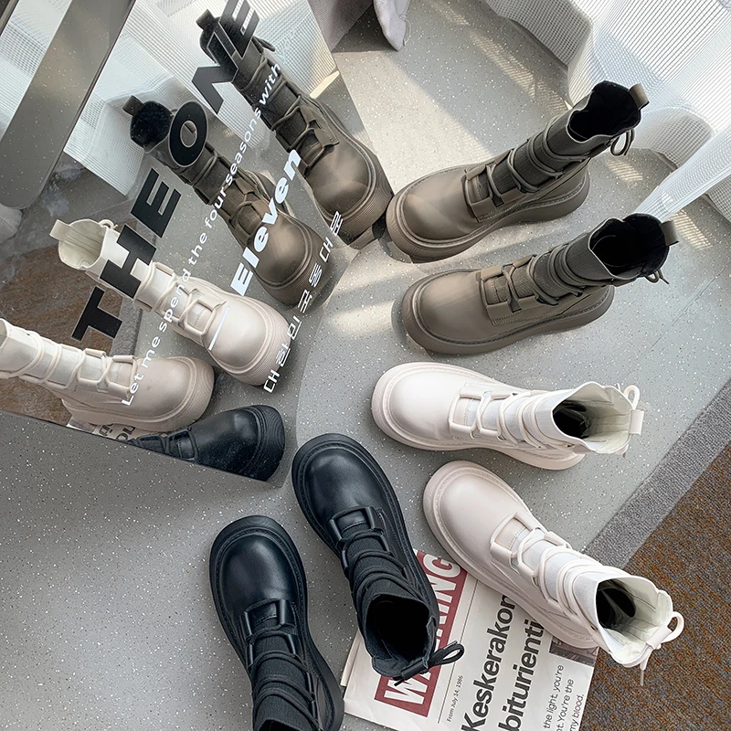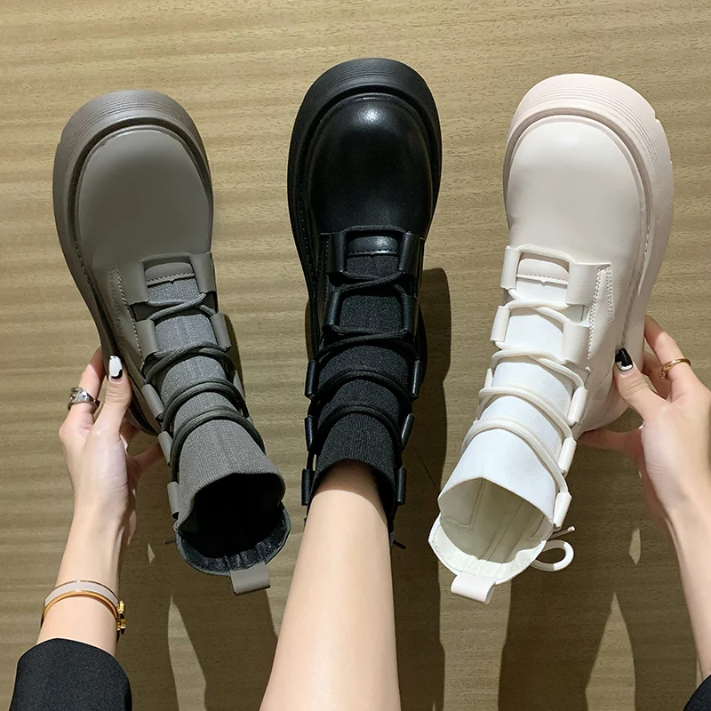 Женские эластичные ботинки на резиновой подошве, полуботинки для женщин, Новинка осени 2021, модные черные мартинсы с круглым носком и перекрестной шнуровкой
