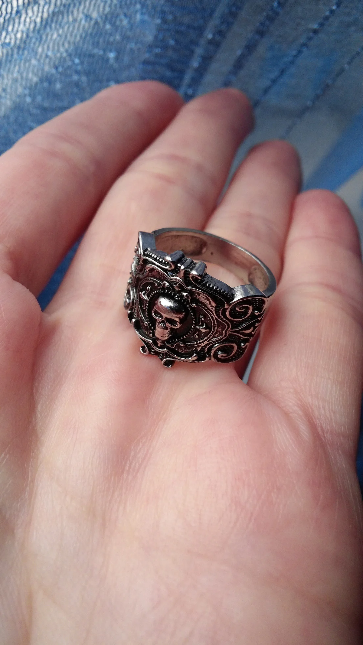 Кольцо не похоже ни на первую, ни на последующие картинки! Видно, что и на них разные изделия, на деле же приходит третий вариант :-) И на мой взгляд, он однозначно женский, для мужского перстня - слишком изящный и маленький. Но и весьма симпатичный! Череп тут есть, а костей не найдете :-) Да и вообще рисунок другой, но детализация хорошая. Мне колечко понравилось, более того, оно подошло на тот палец, на который мне трудно что-то подобрать, так как 5 (15) встречается редко. Да-да, заказывала я 6, а по факту это 5, то есть и размер гуляет. Звезду снимать не буду, отзывы с фото есть, пусть каждый сам для себя решает, хочется ему такое кольцо или нет. Я по итогу осталась довольна, несмотря на все несовпадения. Продавец контактный, дружелюбный. Чуток пообщались, потому что посылка долго не отправлялась; оказалось, их там закрыли из-за короны. Поэтому доставка до Москвы почтой заняла больше месяца. Большое спасибо продавцу! Ношу кольцо с удовольствием :-)