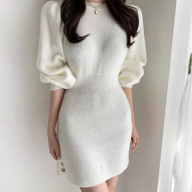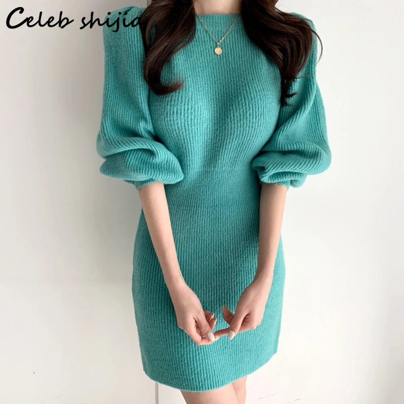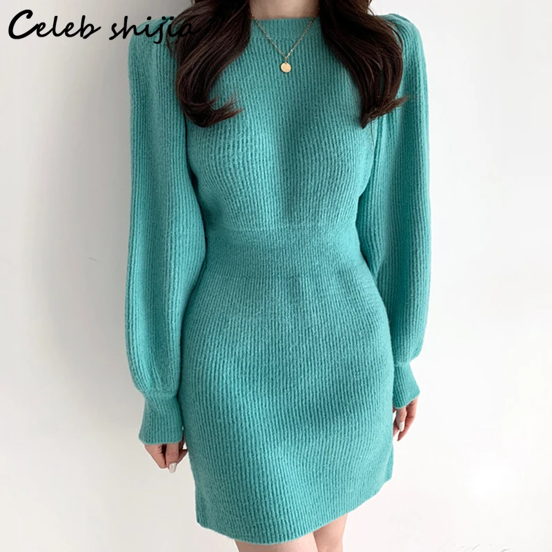 Шикарное вязаное платье с рукавами-фонариками, женское осеннее эластичное платье-свитер с высокой талией, облегающее корейское пикантное мини-платье Y2k на зиму, 2021