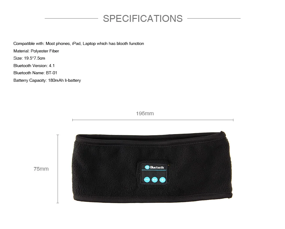 Характеристики:Совместимость с: большинством телефонов, iPad, ноутбуков с функцией bluthМатериал: полиэфирное волокноРазмеры: 19,5x7,5 смВерсия Bluetooth: 4,1Название Bluetooth: BT-01Емкость аккумулятора: 180 мАч li-batteryХарактеристики: Handband с Bluetooth и длительным временем приема супер сигнала и голосовым чатом до 10 метров HD HIFI Качество звука и простое управление громкостью: hi-Fi класс позволяет избежать ненормального шума и оставить правильные каналы этого феномена, чтобы качество звука было более полным и чистым. Совместим с большинством телефонов, iPad или ноутбуков, которые имеют Bluetooth съемные Bluetooth:Вы можете снять bluetooth-гарнитуру перед стиркой повязки на рукуУпаковочный лист: 1 х головная повязка 1 х гарнитура BloothtoothСоветы: возможны отклонения в размере 2-3 см, bluetooth-гарнитура с регулируемой окружностьюПримечание: по этой ссылке мы предлагаем вашему выбору модель из бархата и вязания, эта функция такая же, как у вас, спасибо