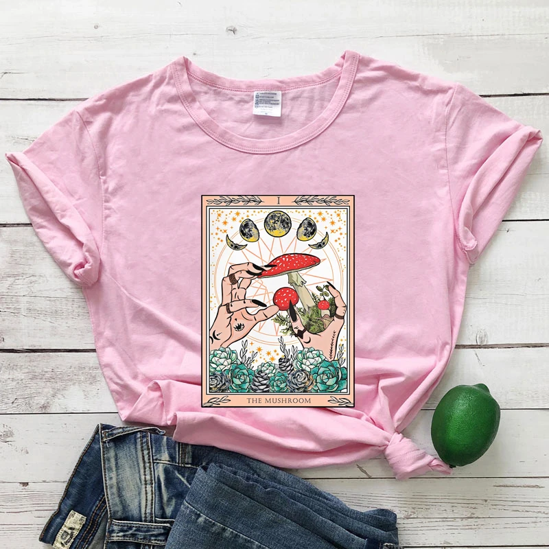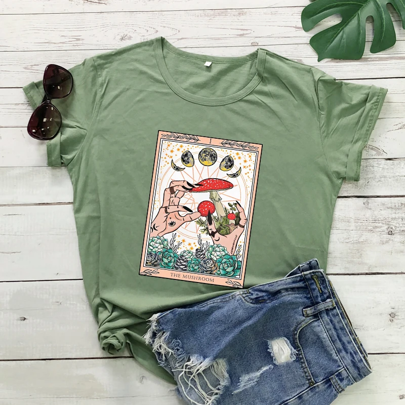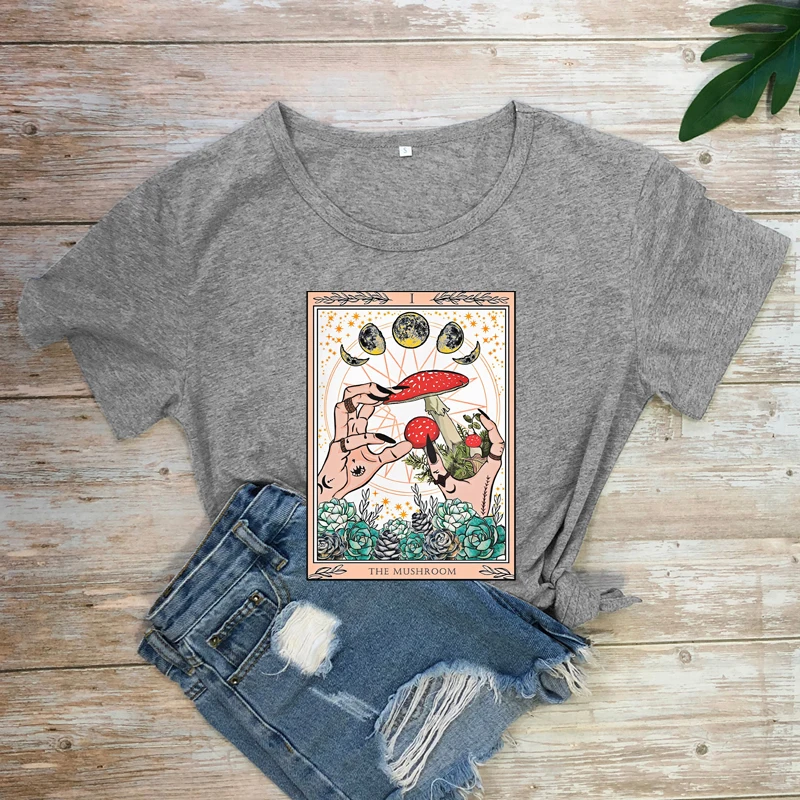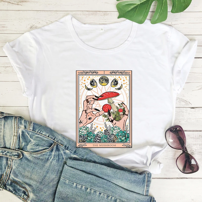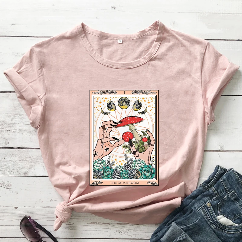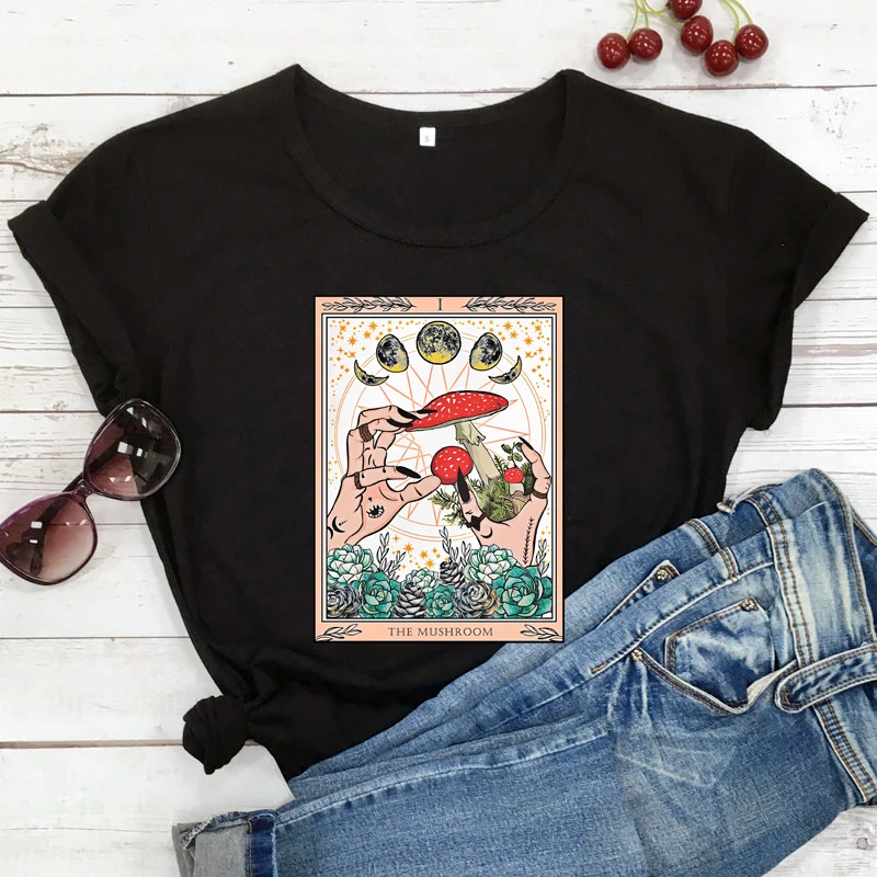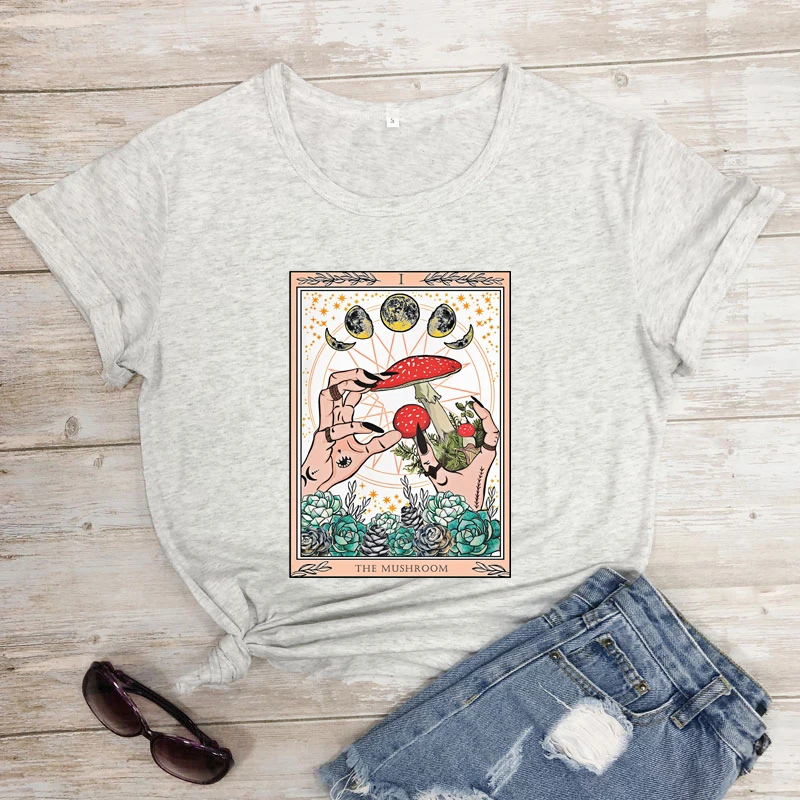 Футболка женская с принтом Таро и грибов, винтажная хлопковая рубашка с волшебными грибами, в готическом стиле, с фазами луны и ведьмы, Топ