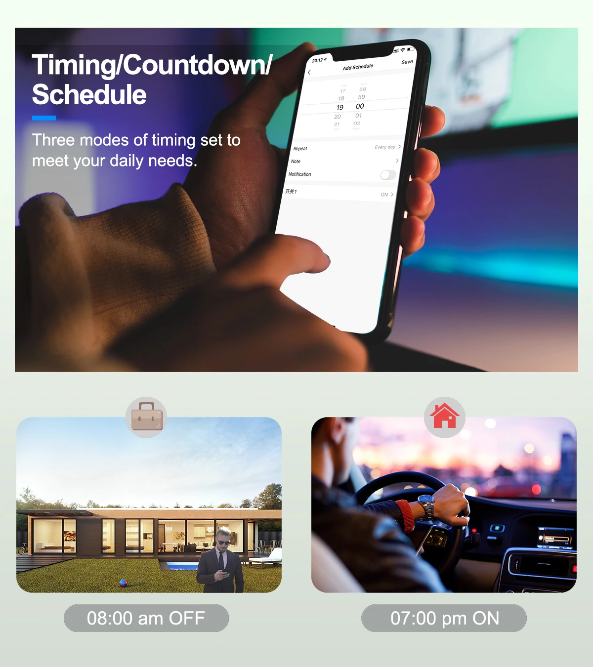 4. Полностью Контролируйте подключенные устройства с таймером, расписанием и обратным отсчетом (1/5/30 минут, 1 час и т. д.) с помощью приложения; Делитесь контролем с семьей и друзьями для дополнительного удобства.