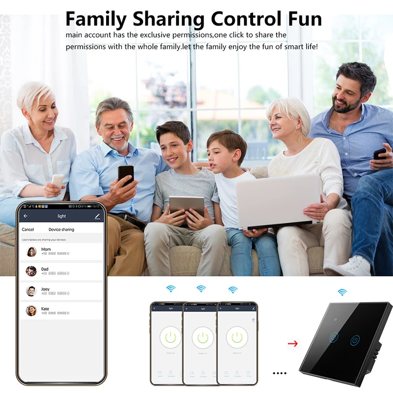 1. Новая идея для тех, кто увлекается для 1/2/3/4 способ цепью повторного включения (два переключателя управления один светильник) о том, что объясняется как мультиконтроль ассоциации этого перейти к другим Wi-Fi умные выключатели в приложение; Емкостным сенсорным управлением, включите/выключите светильник одним касанием и устойчивостью к царапинам стеклянная панель дает лучший вид, чтобы сочетаться с любым дизайном стены. (Примечание: Вы можете использовать многоконтрольную связь этого переключателя для нескольких различных переключателей, но несколько банд на одном коммутаторе недоступны, только одна банда на одном коммутаторе может быть связана для мульти-контроля.)