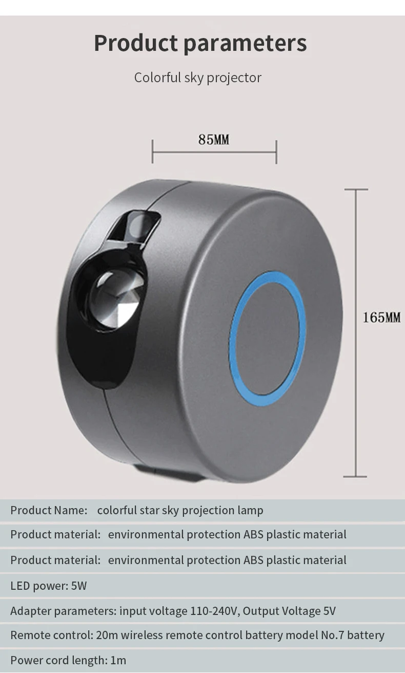 1.6 цветов динамических проекций: разные цвета в сочетании с динамической проекцией ночного неба различных скоростей, создавая расслабленную, романтичную, красочную атмосферу проекции пространства, чтобы показать вам великолепное звездное небо.