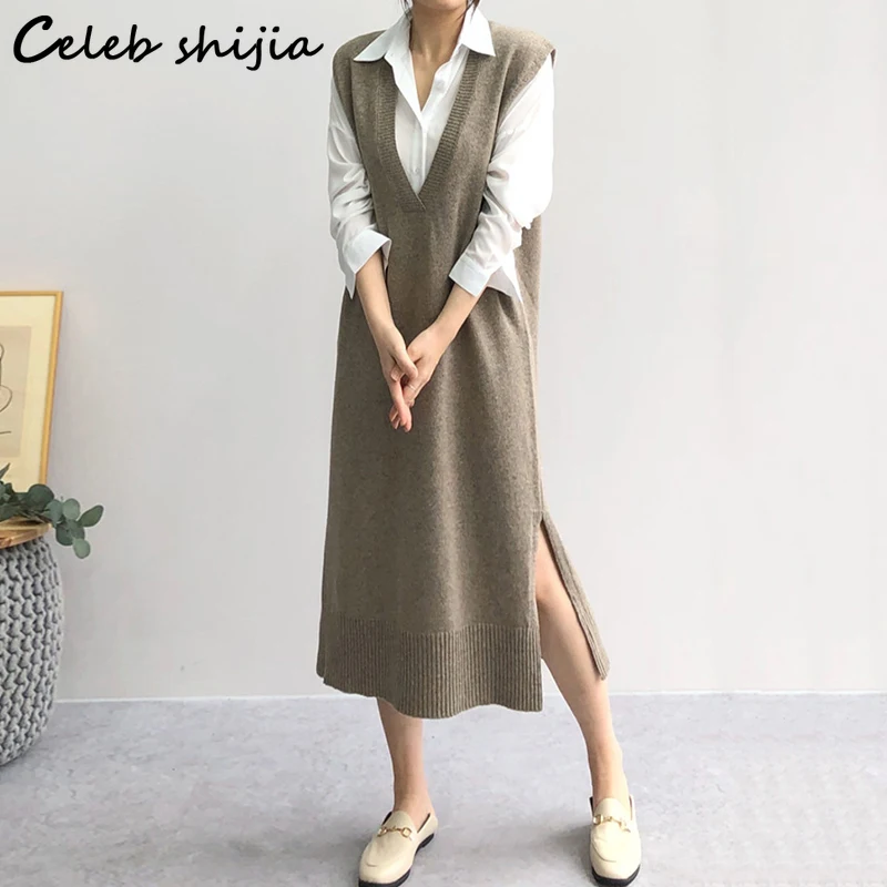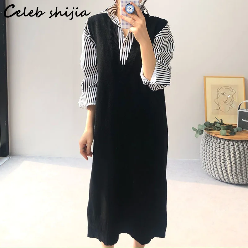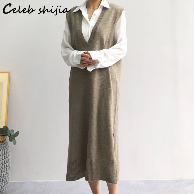 Женское трикотажное платье, длинное винтажное платье-свитер черного цвета, без рукавов, с V-образным вырезом, в Корейском стиле, осень 2021