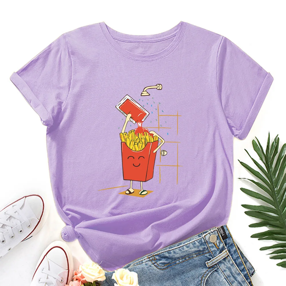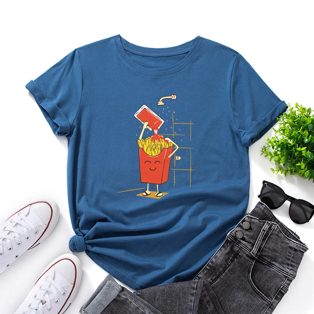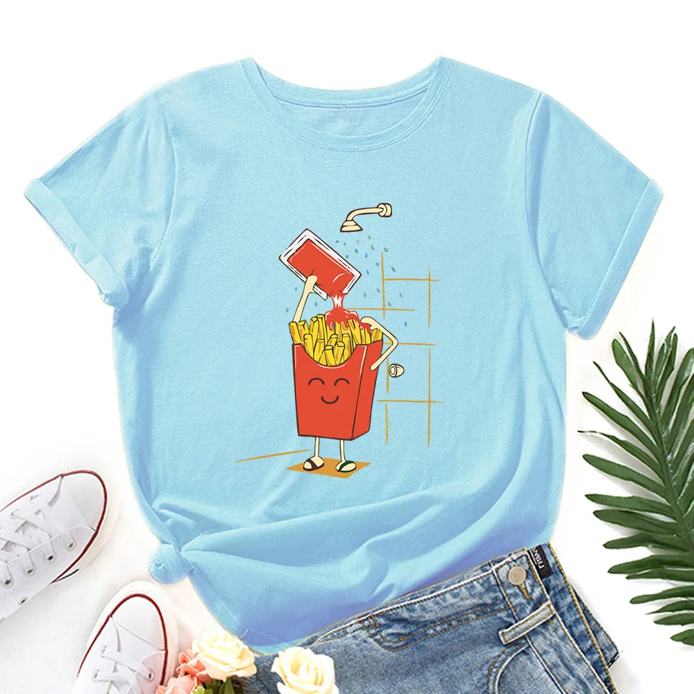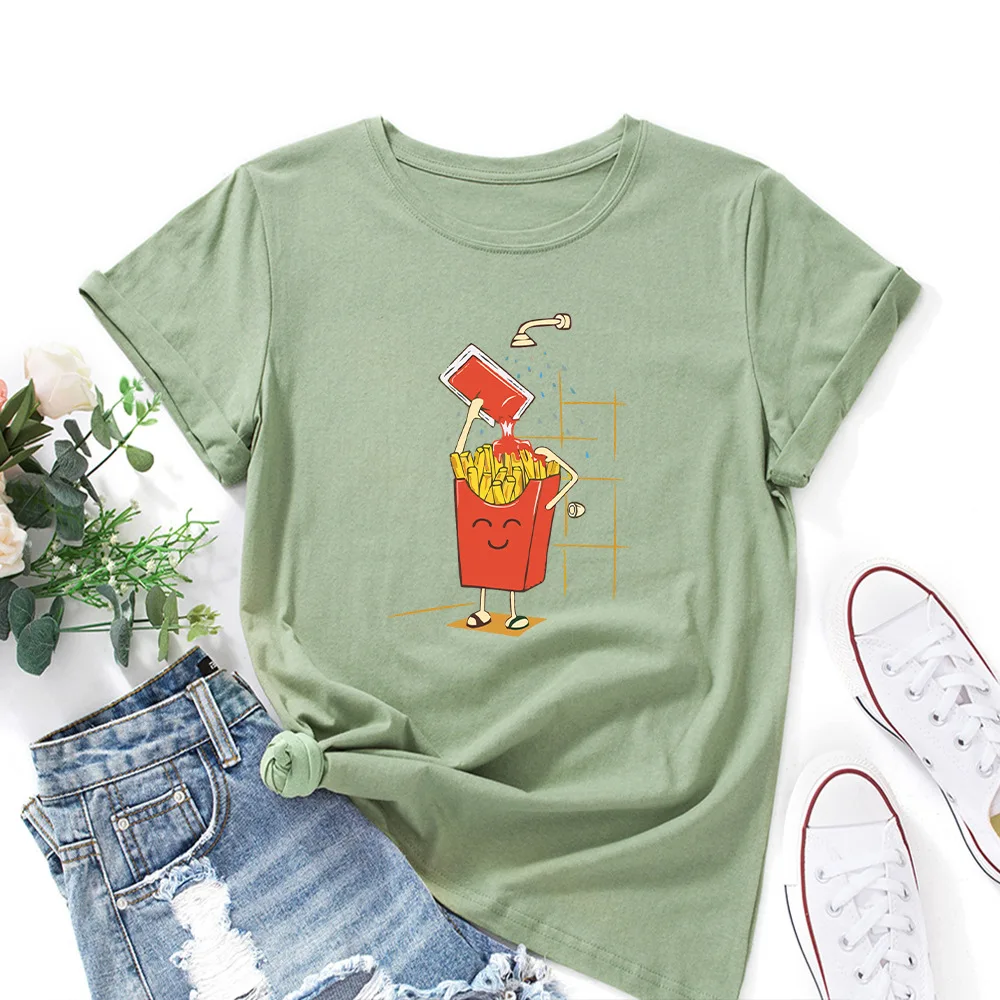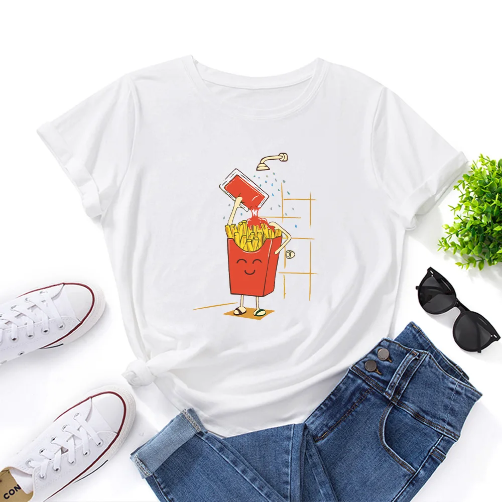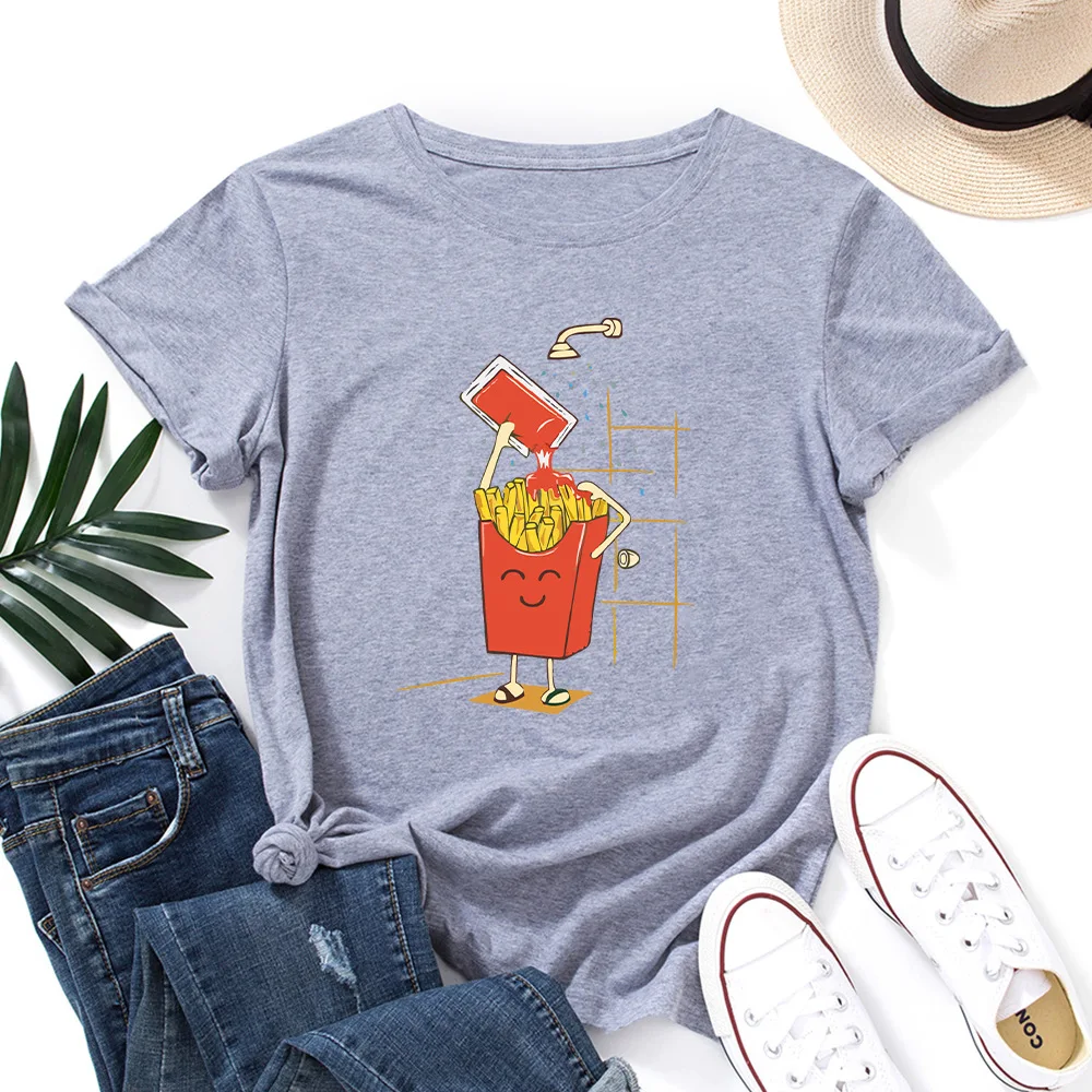 Женский хлопковый топ с коротким рукавом, забавный кетчуп с рисунком картошки фри, пиццы, лето футболка "еда"