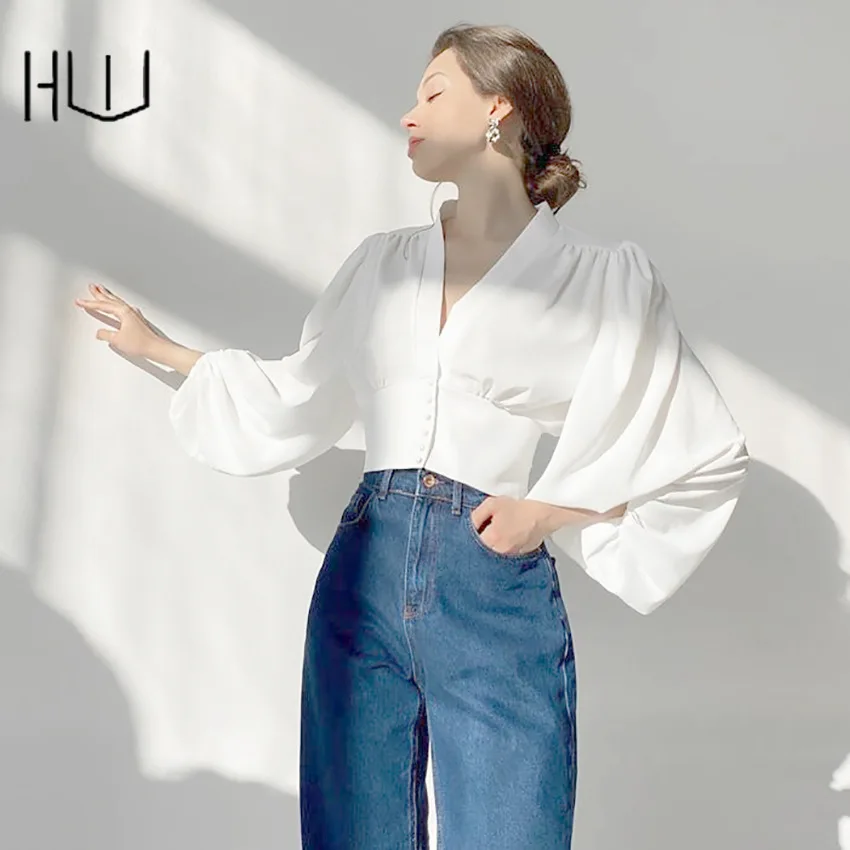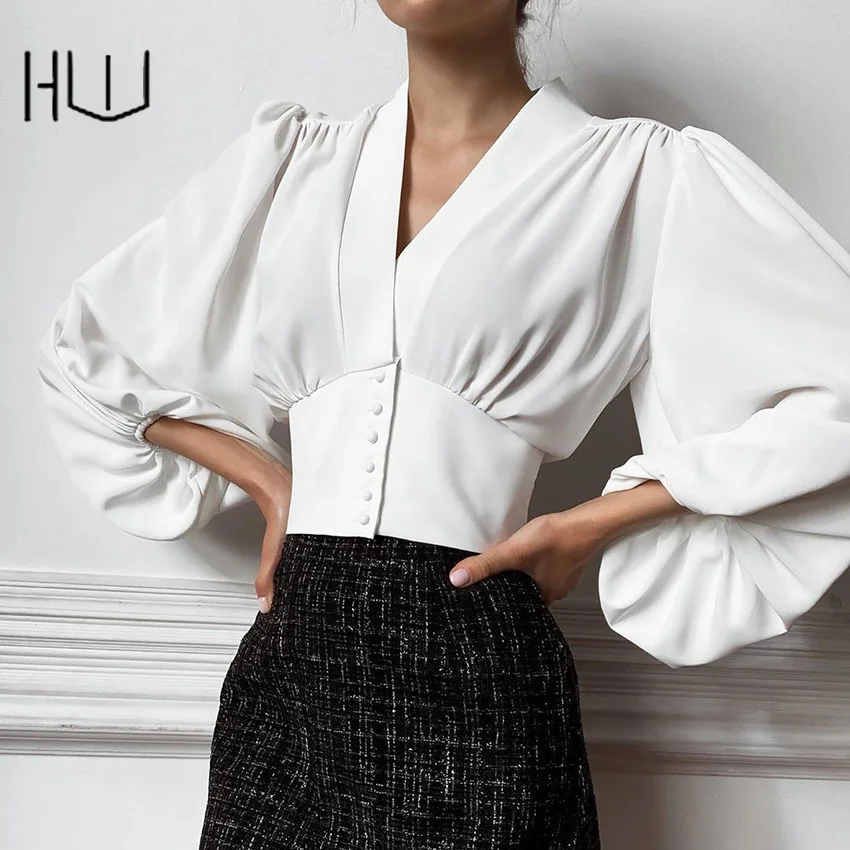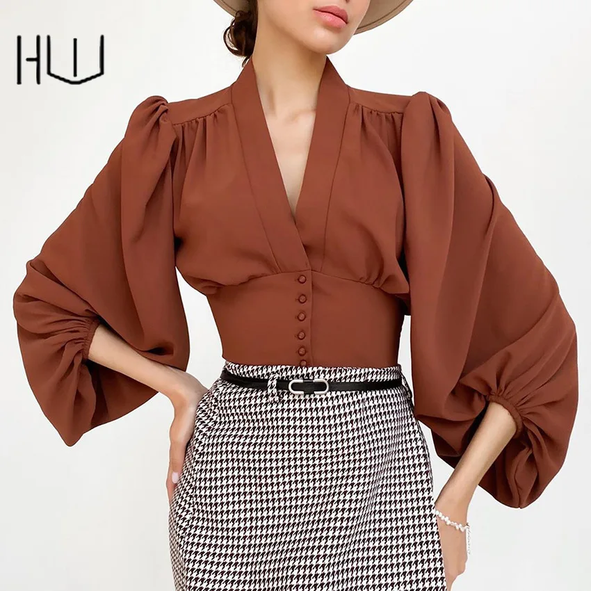 Женская рубашка-поло с длинным рукавом-фонариком, V-образным вырезом и пуговицами